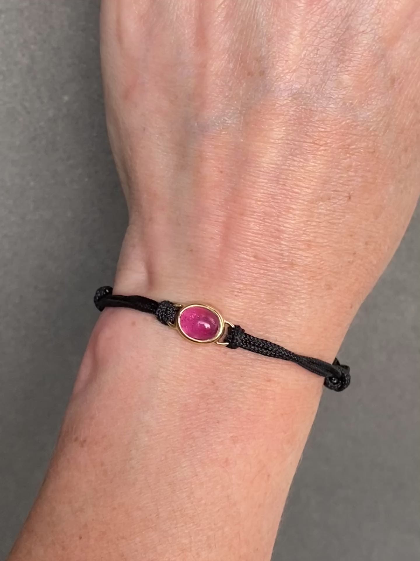 De Cobble Stone armband is een ode aan de eenvoud van de natuur. Met de hand gemaakt van 14 karaats gerecycled geelgoud en een verstelbare nylon band, draagt dit sieraad een roze toermalijn van 8 bij 6,5 millimeter in cabochon slijpvorm. Zacht afgerond, als een rivierkeitje dat jarenlang door het water is gevormd. Het herinnert aan hoe bijzonder edelstenen zijn ontstaan, niet in haast maar in geduld en stilte.