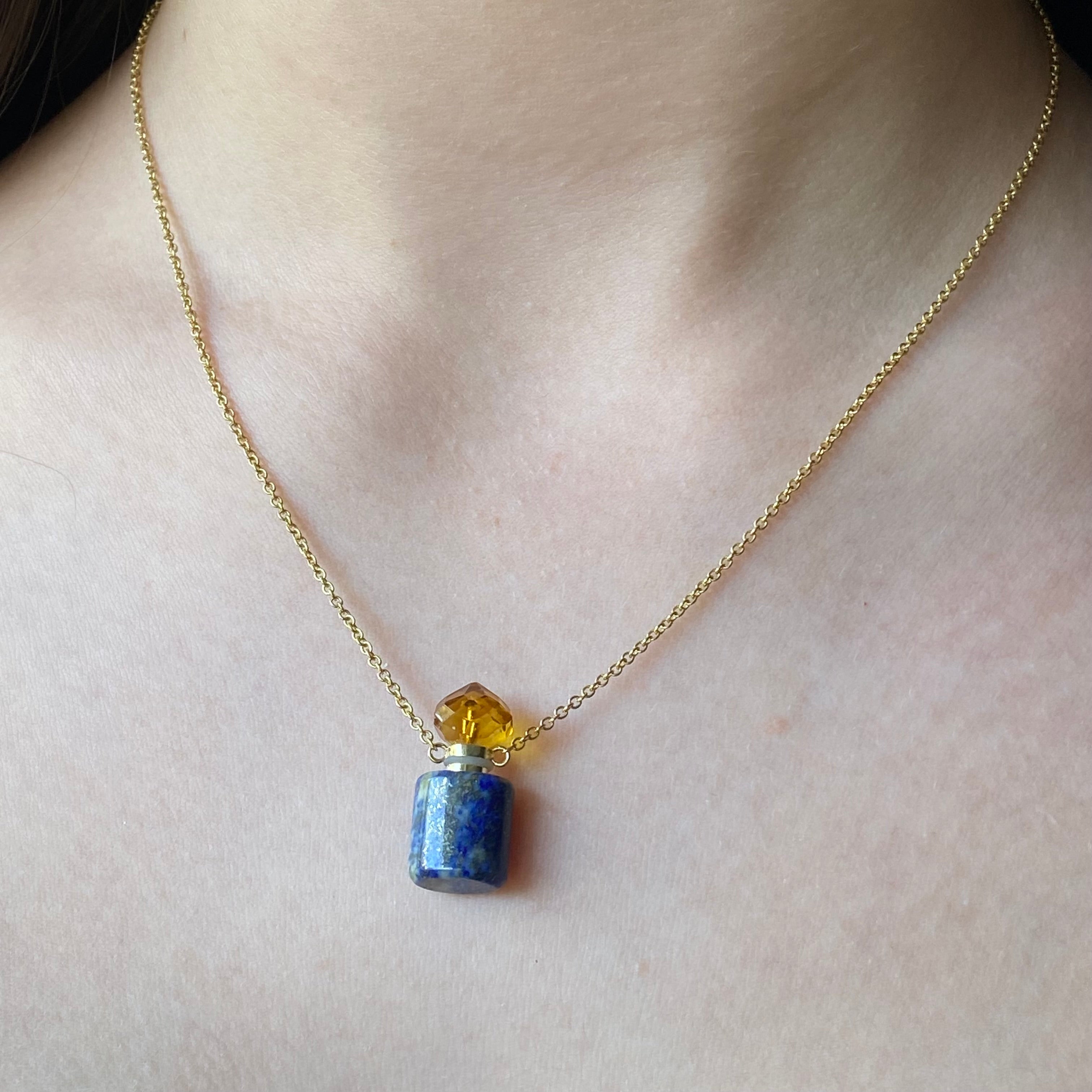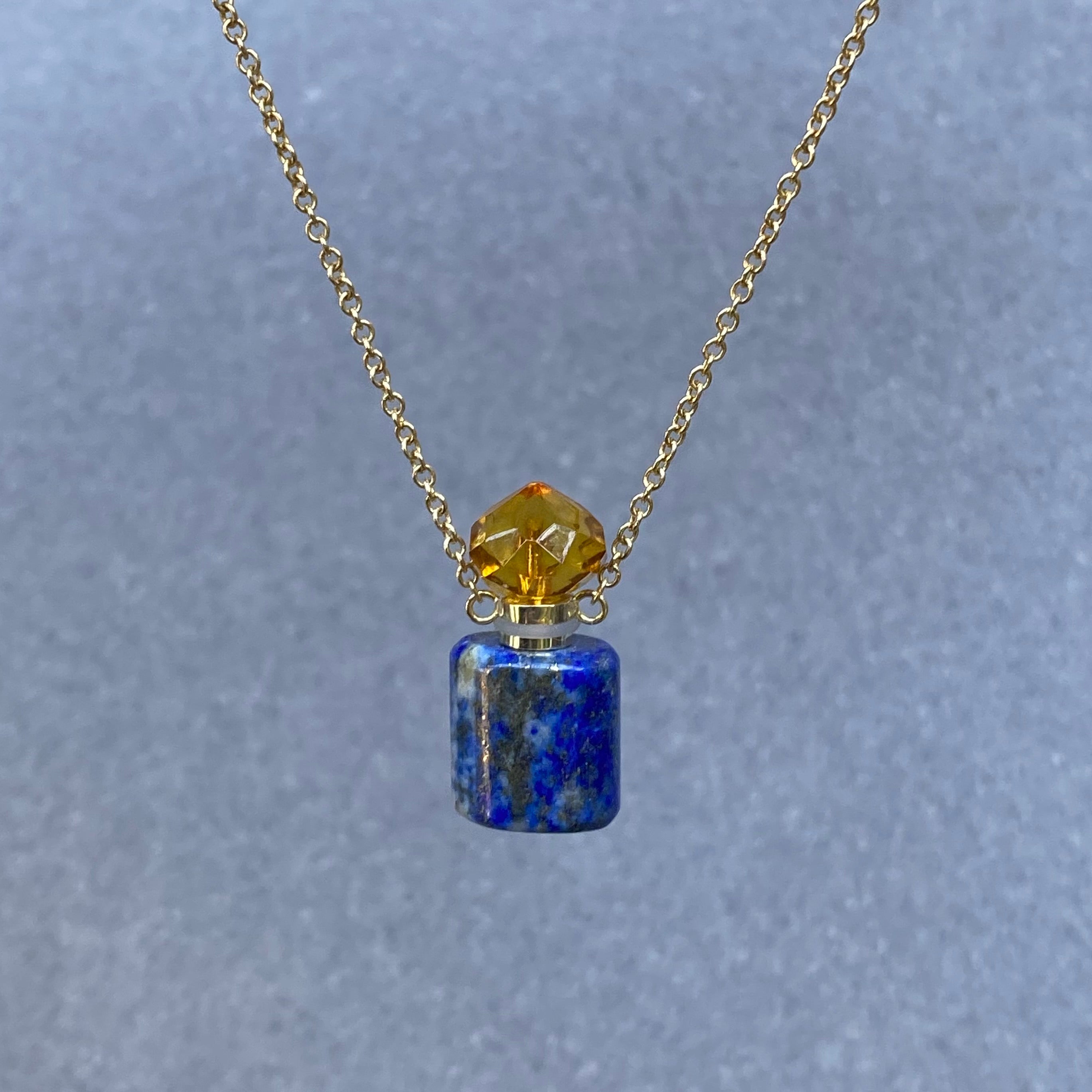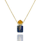 Golden Night is een ode aan wat blijft, zelfs als het leven verandert. In mijn atelier in Rotterdam maak ik elk exemplaar met de hand, met zorg voor detail en gevoel. De hanger bestaat uit een ovaal cilinder geslepen lapis lazuli van 12,5 mm, met een diepe blauwe kleur die rust en kracht uitstraalt. Daarboven rust een druppelvormige barnsteen van 8 mm, honingkleurig en helder, als een straal zonlicht in de avond. Samen vormen ze een harmonieuze balans tussen licht en donker, zachtheid en stevigheid. In een kleine uitholling in de lapis lazuli wordt een beetje as bewaard, veilig afgesloten met een handgemaakt geelgouden schroefkopje. Zo draag je wat je koestert altijd bij je, dichtbij en onzichtbaar.