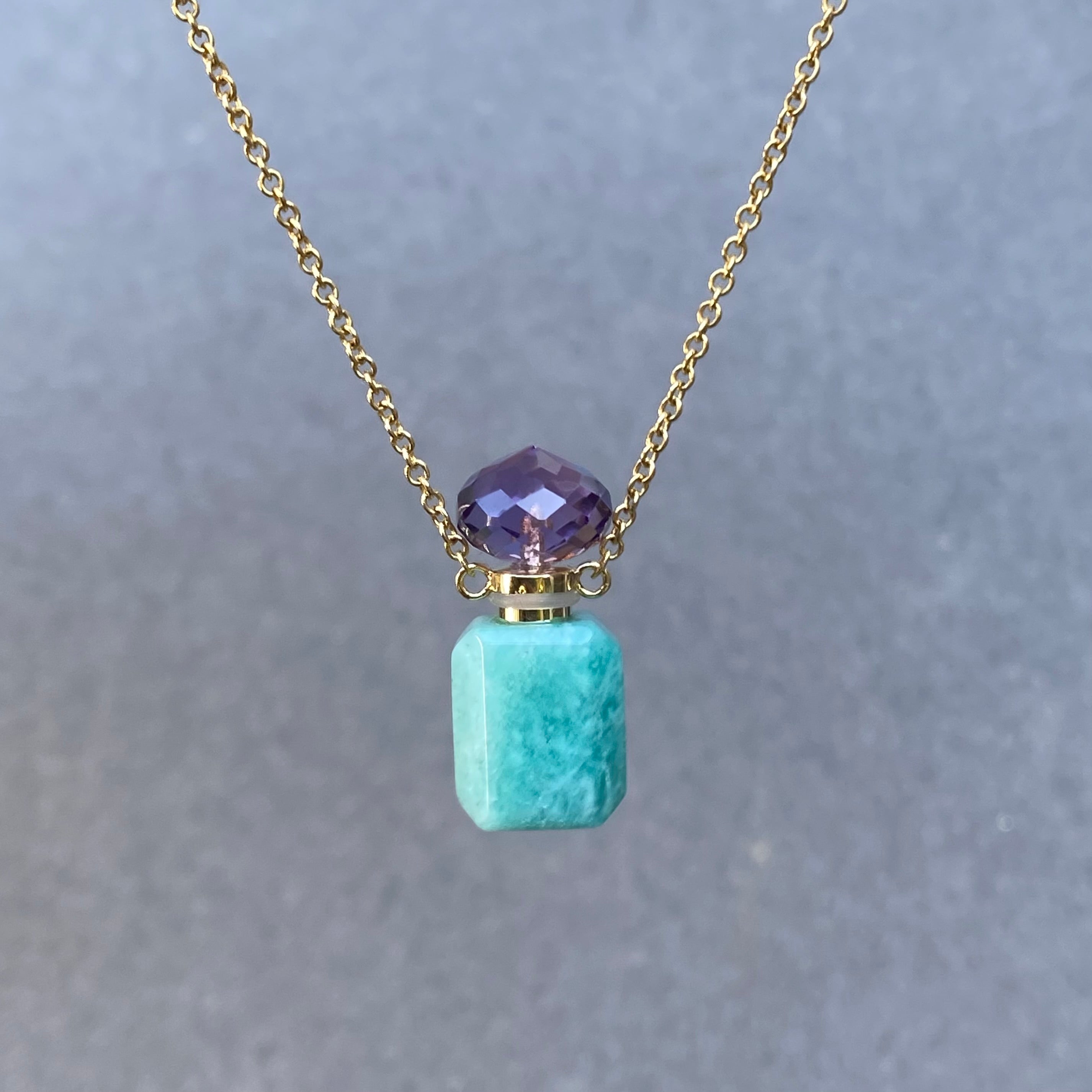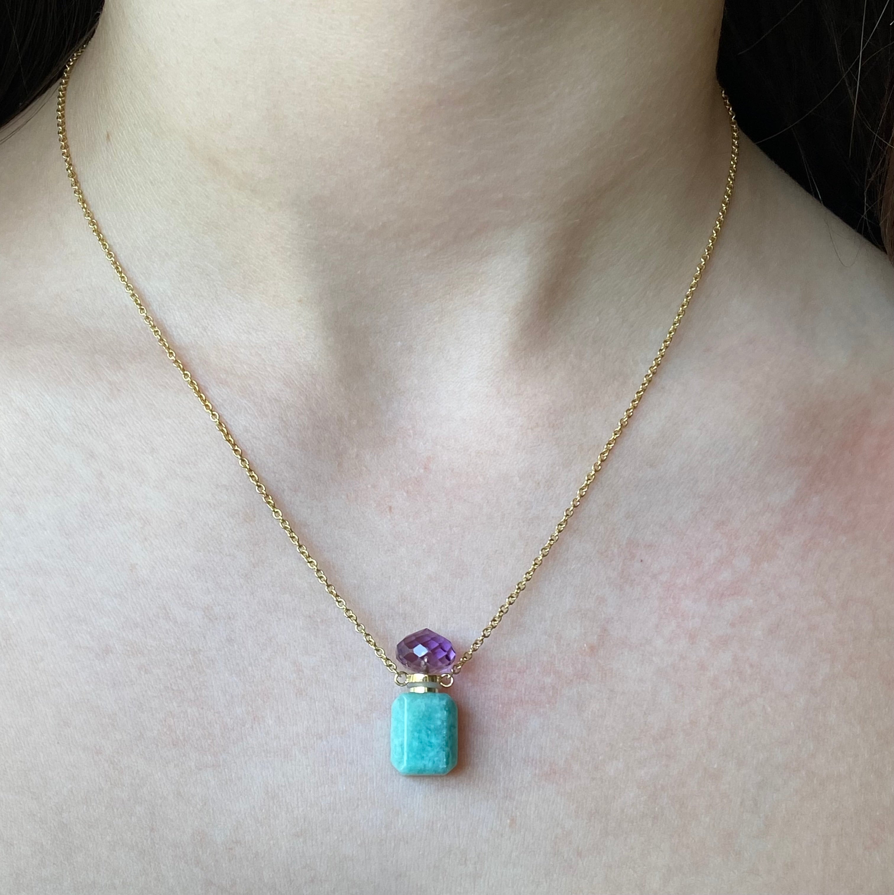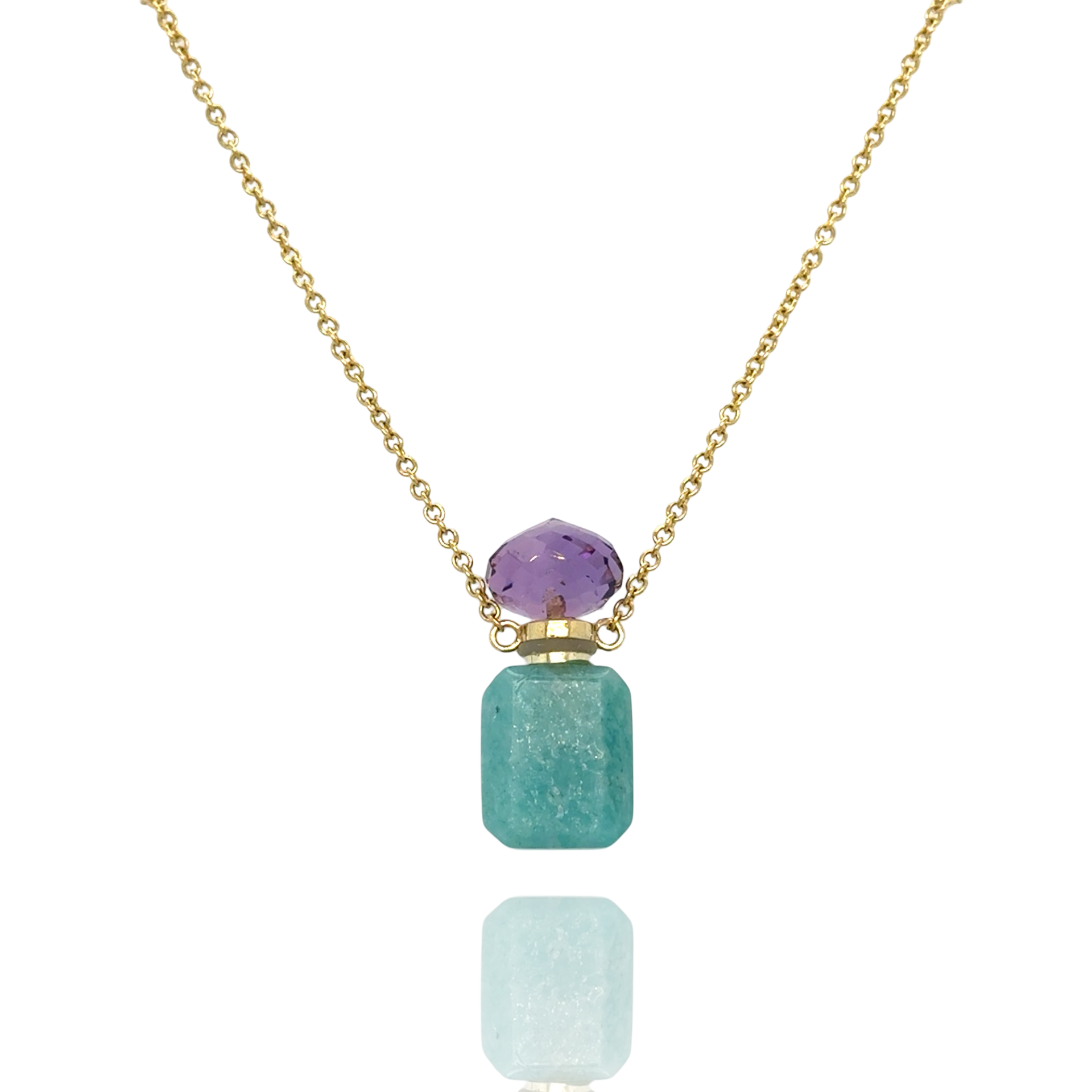 Lavender Tide is een sieraad dat je herinnert aan de kracht van zachtheid. Met de hand gemaakt in mijn atelier in Rotterdam, als eerbetoon aan wie je dichtbij wilt houden. De hanger bestaat uit een vierhoekige amazoniet van 12,5 mm, facetgeslepen zodat haar zachte groentinten tot leven komen. Bovenop rust een druppelvormige amethist van 8 mm, gefacetteerd en met een paarse gloed die kalmte uitstraalt. Samen vangen deze stenen de beweging van herinnering: licht en stromend, diep en liefdevol. In een uitholling in de amazoniet wordt, onzichtbaar maar voelbaar, een beetje as bewaard. Het geelgouden schroefkopje sluit dit veilig af, zodat je altijd bij je draagt wat je wilt koesteren.