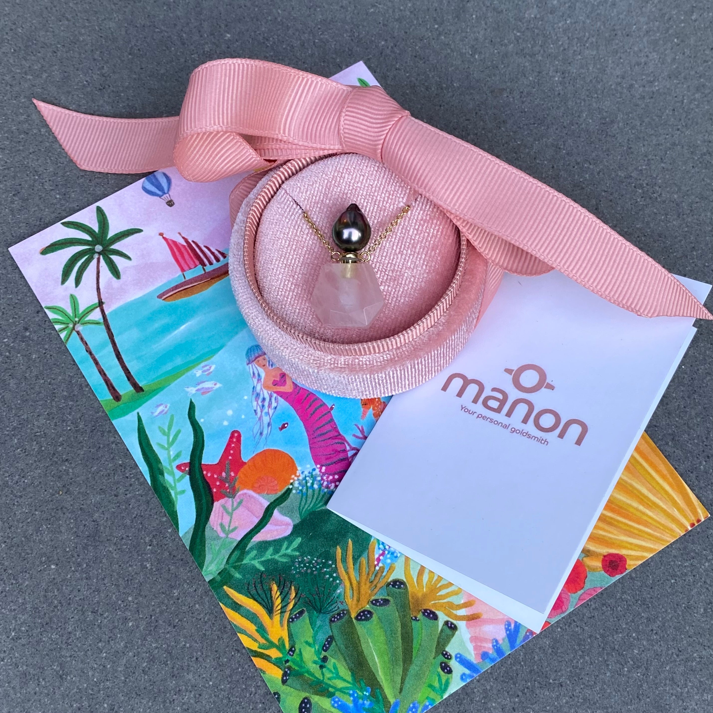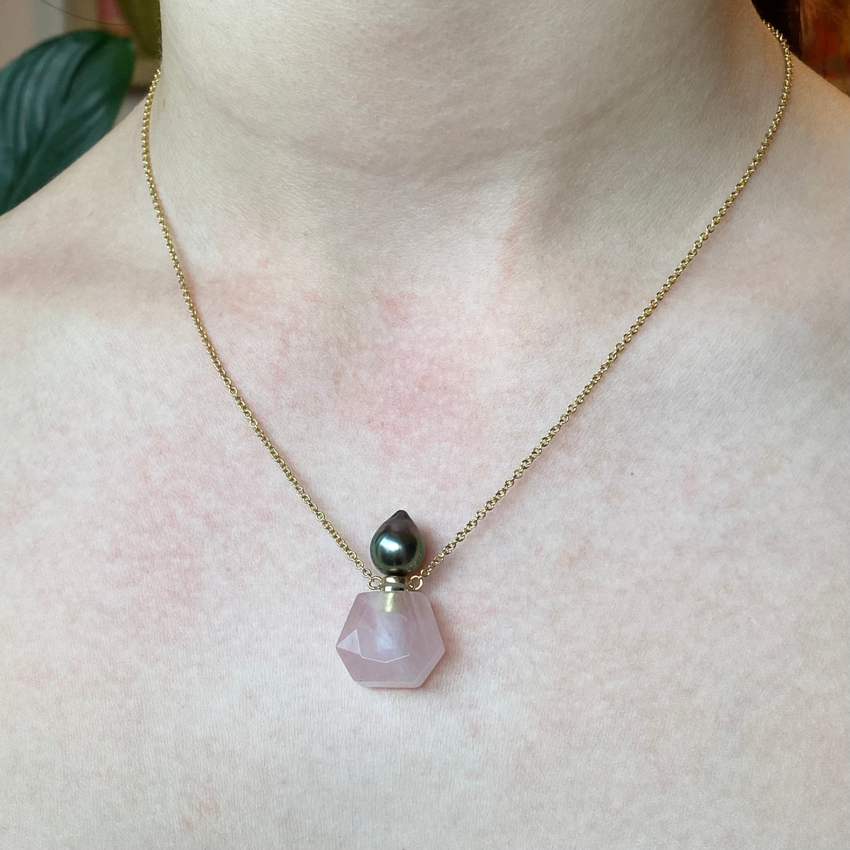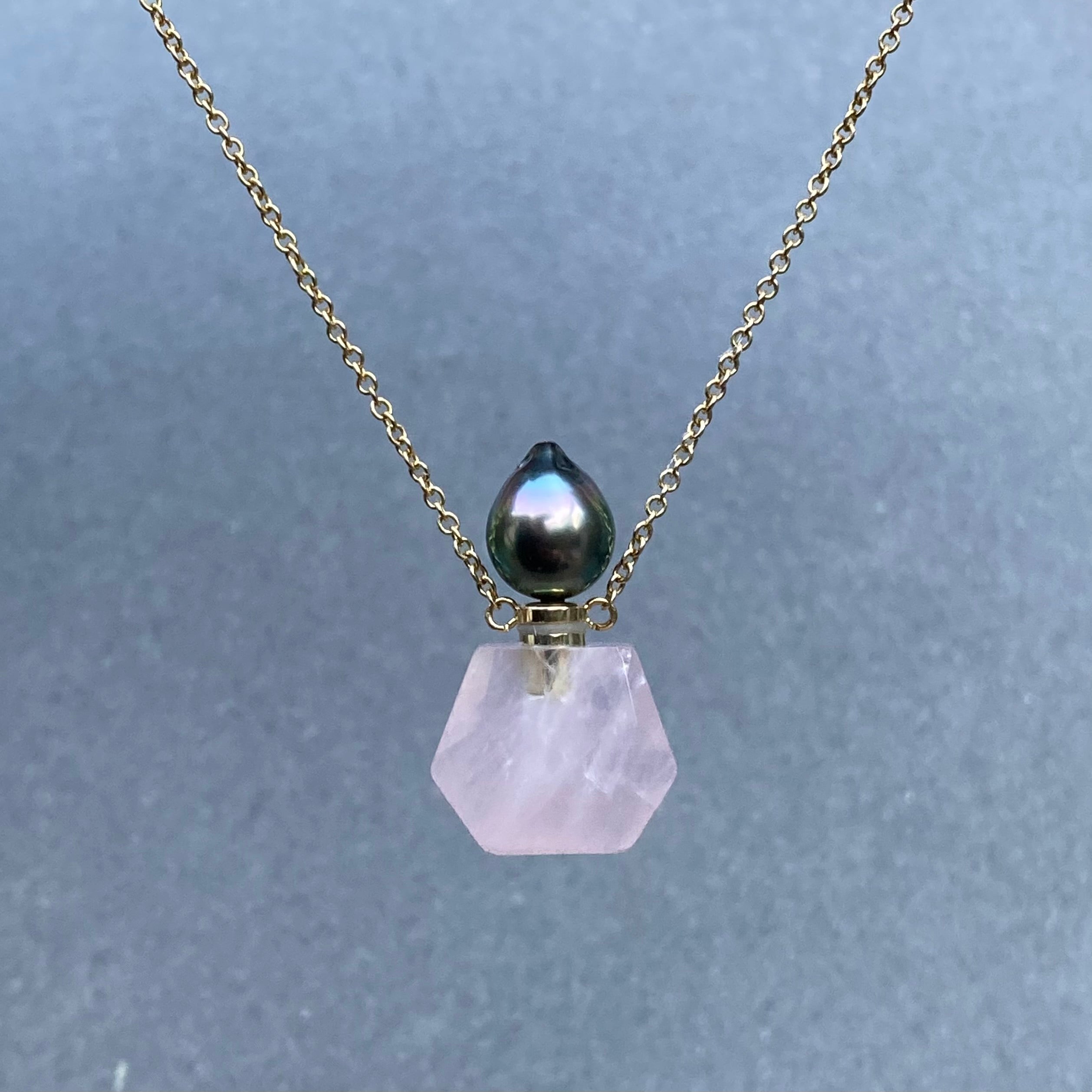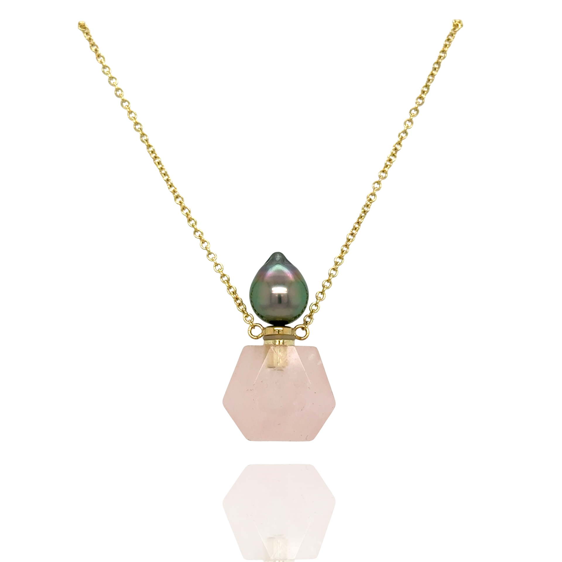 Deze parfum- en ashanger hangt aan een ketting van 14 karaats geelgoud van 42 cm lang, met een fijn anker collier en een subtiele karabijnhaaksluiting. De hanger kan worden gevuld met een beetje parfum of een symbolische hoeveelheid as. Zo draag je wat je lief is letterlijk dichtbij je hart. De zachte glans van de rozenkwarts weerspiegelt liefde en mededogen, terwijl de Tahiti parel innerlijke kracht en emotionele balans symboliseert.