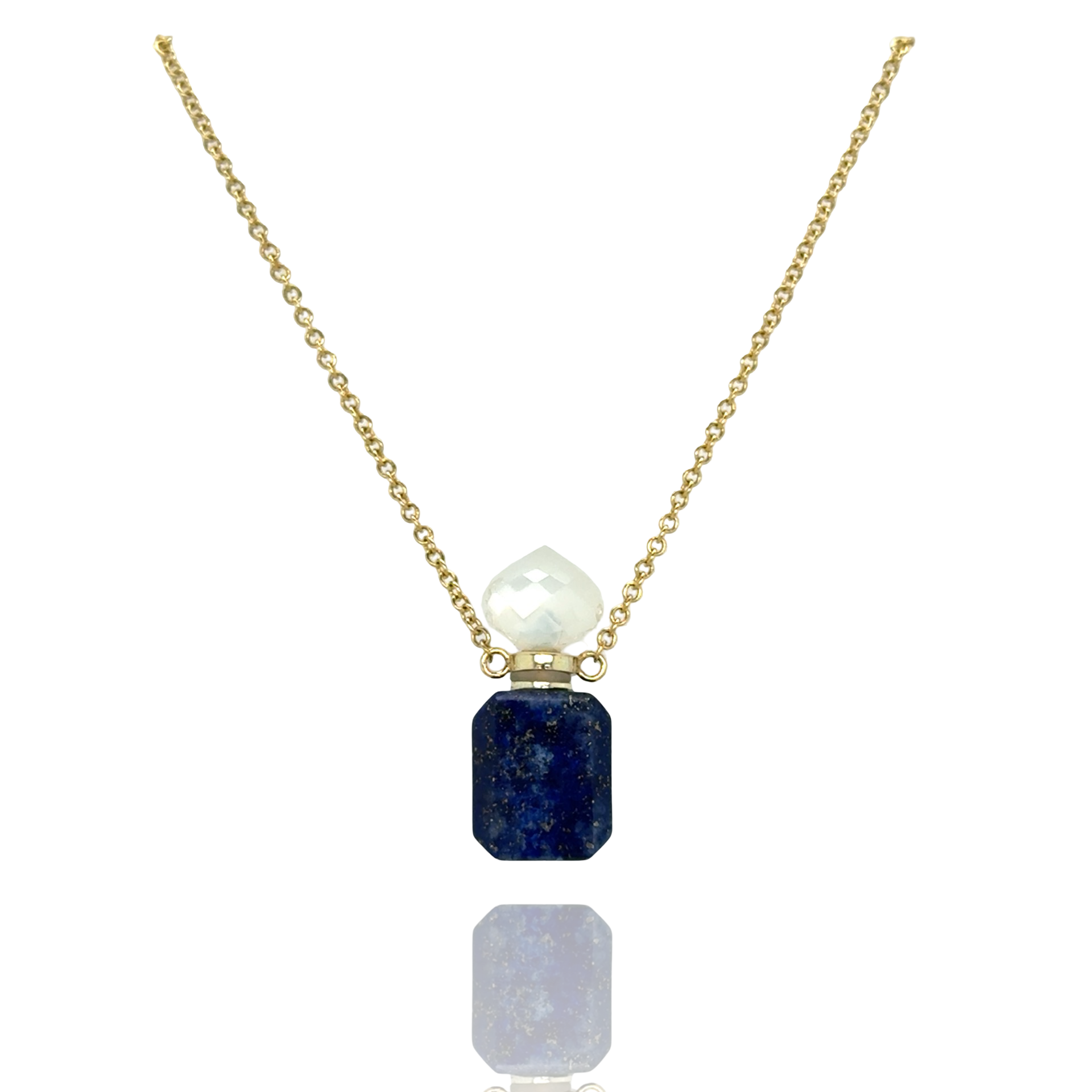 Lapis lazuli staat bekend als een steen van innerlijke waarheid, kracht en diepe wijsheid. Maansteen brengt zachtheid, troost en versterkt de intuïtie. Samen herinneren ze je aan wat er was, en wat er altijd zal zijn.