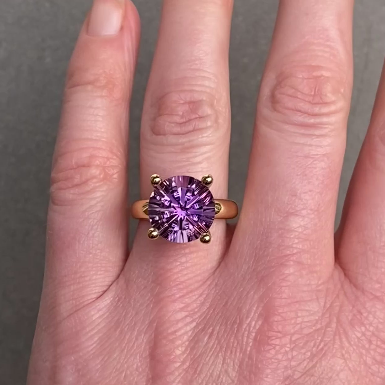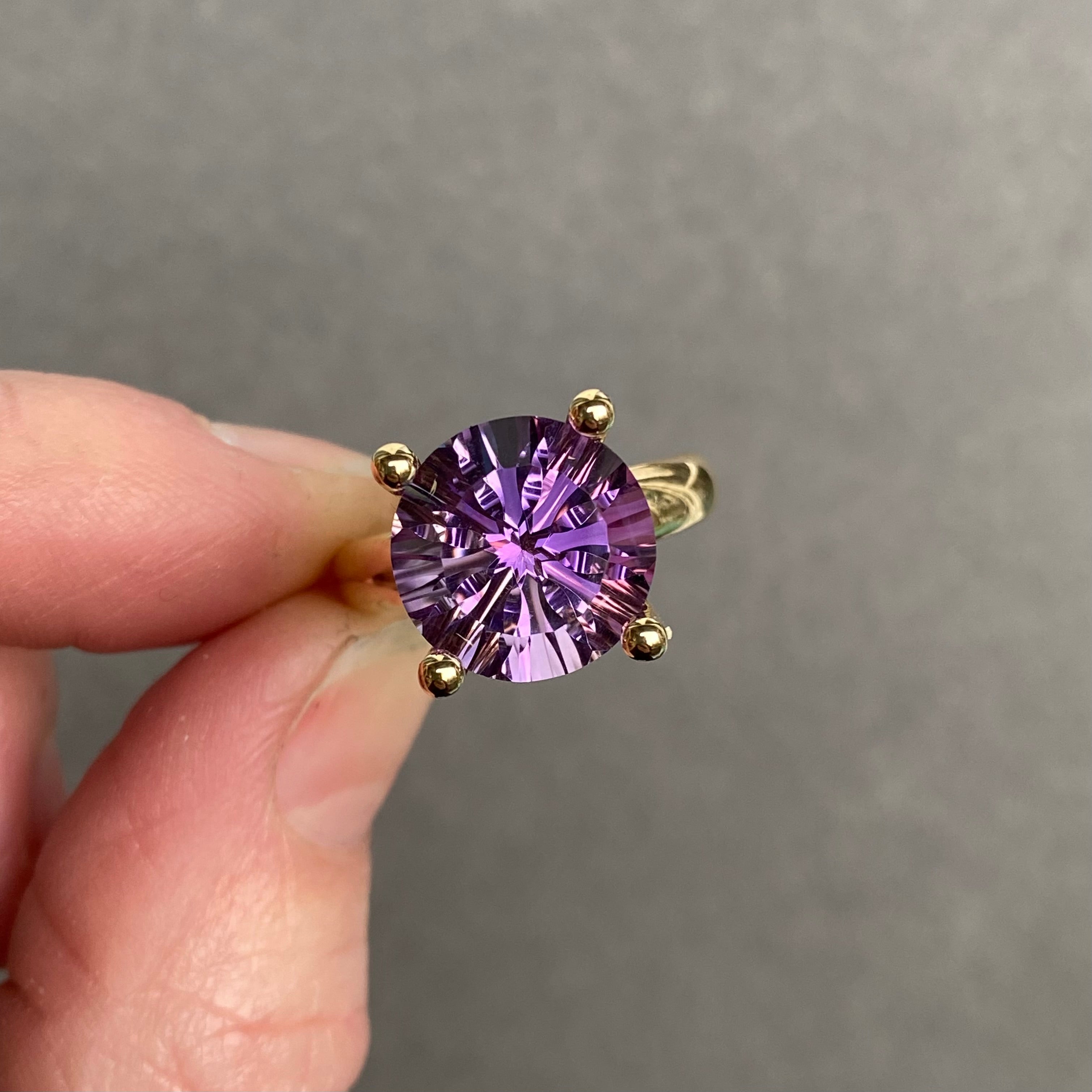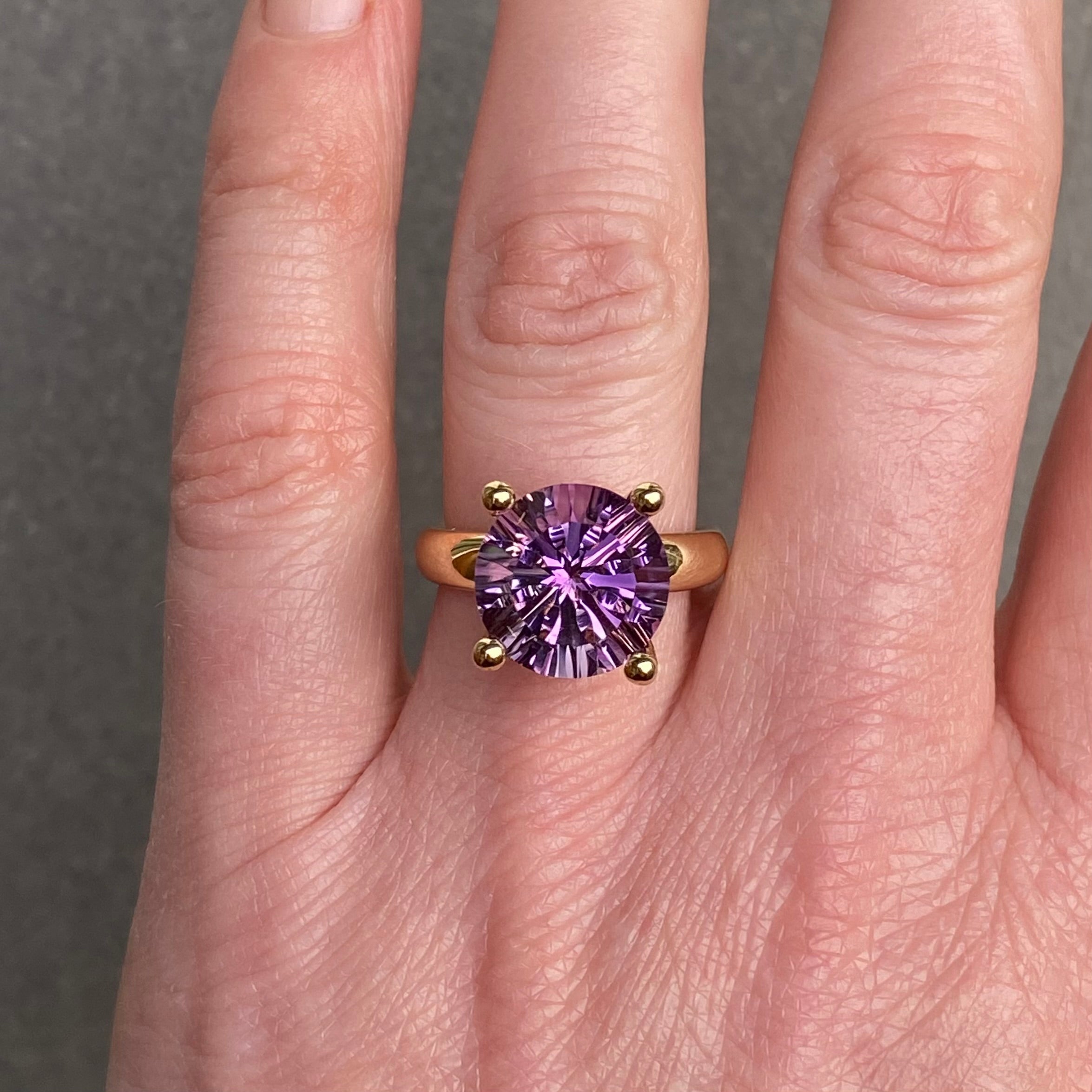De #14 Collector’s ring Amethist is een zeldzaam en expressief stuk binnen de exclusieve Collector’s collectie. In het hart straalt een ronde, lasergeslepen amethist van 12 millimeter. De bijzondere facetten vangen het licht als kristallen vensters en laten schakeringen van lavendel en diep paars oplichten bij elke beweging. Een ring die speelt met licht én met betekenis.