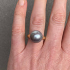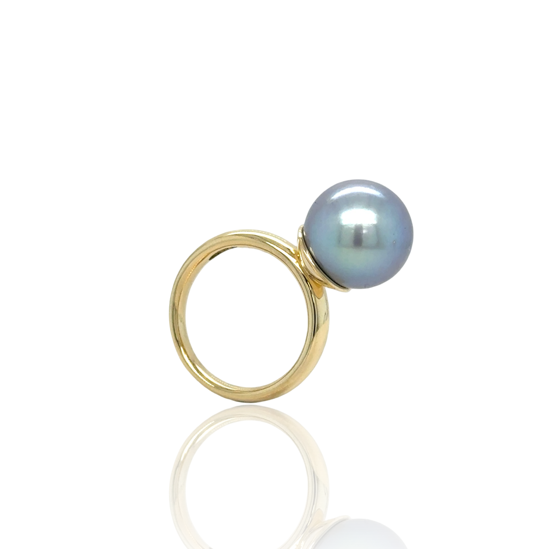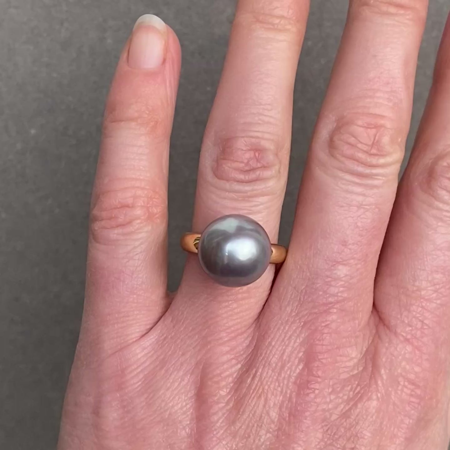 De #18 Collector’s ring Lichtgrijze Parel is een verfijnd en zeldzaam juweel binnen de Collector’s collectie. In het midden schittert een ronde zoetwaterparel van 13,38 millimeter, met een zachte lichtgrijze tint en een subtiele blauwachtige glans. Bij elke beweging vangt de parel het licht op een fluisterende manier, als maanlicht op water. Een sieraad dat rust uitstraalt en diepe elegantie belichaamt.