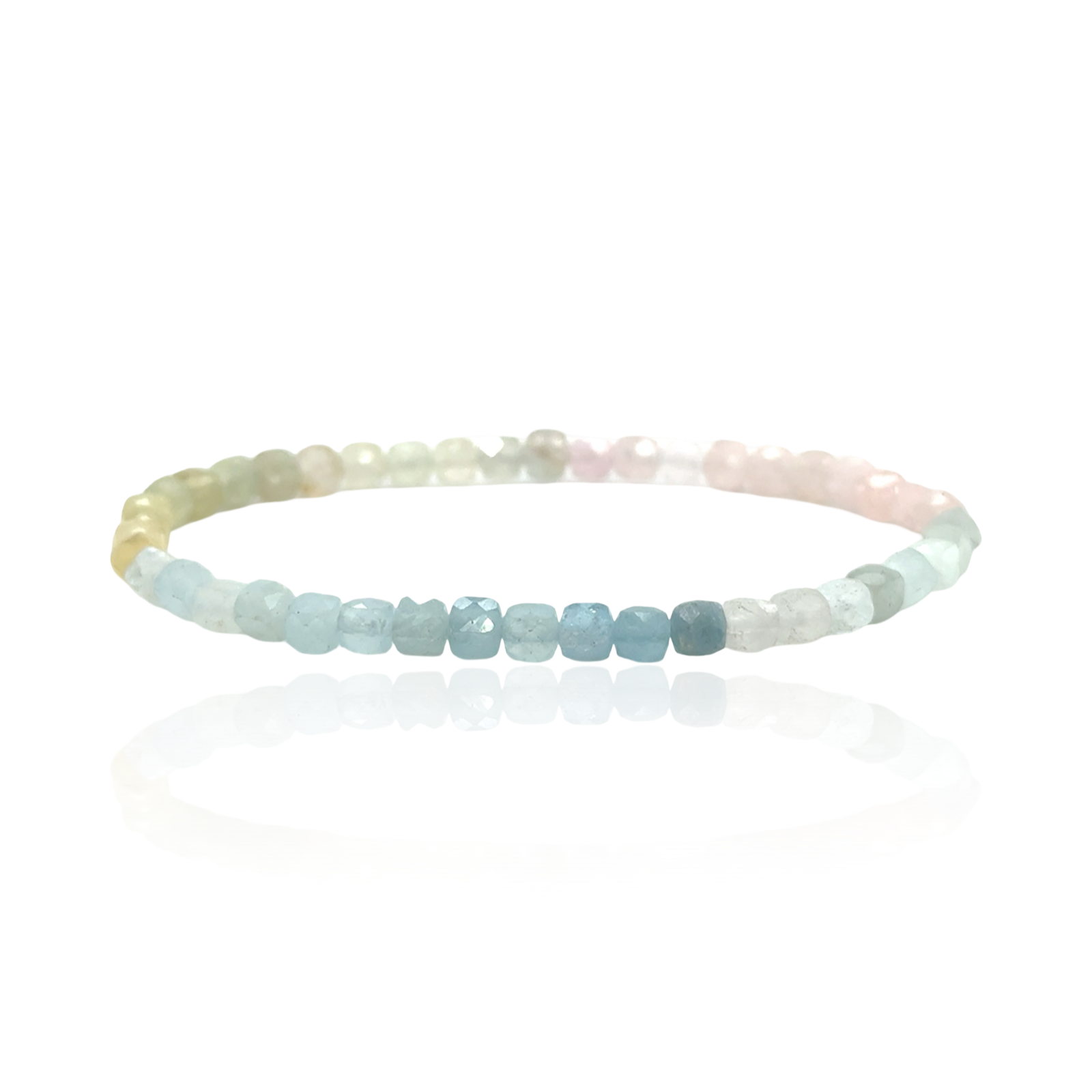 Deze Candy Gems armband is geregen met gefacetteerde berylkralen van 4 mm, in een delicate mix van pastelroze, lichtblauw en zachtgroen. De fijne facetten vangen het licht subtiel op en geven de armband een verfijnde schittering. Met een lengte van 19 cm en elastische afwerking sluit ze soepel en comfortabel om de pols. Binnen de beryl-familie staan de roze tinten bekend als morganiet en de blauwe tinten als aquamarijn – beide geliefd om hun serene uitstraling en betekenis.