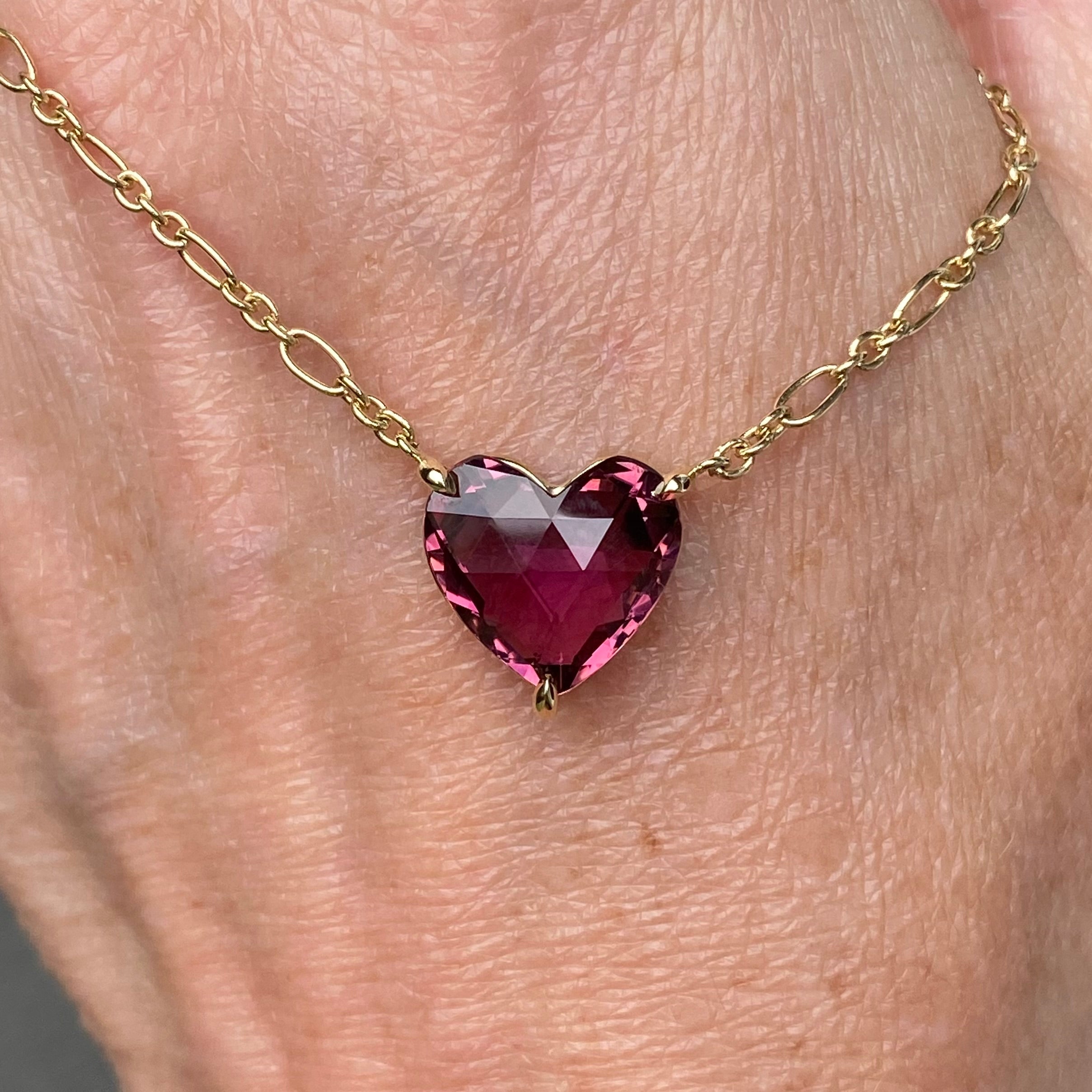 De hanger is gezet in 14 karaats gerecycled geelgoud en verbonden aan een verfijnde ketting van 14 karaats goud, verstelbaar van 42 tot 45 centimeter. De speelse schakels geven ruimte aan het hart om te bewegen en te schitteren zonder te overheersen. De granaat van circa 15 millimeter is klein genoeg om subtiel te blijven en groot genoeg om de aandacht steeds opnieuw te trekken.