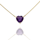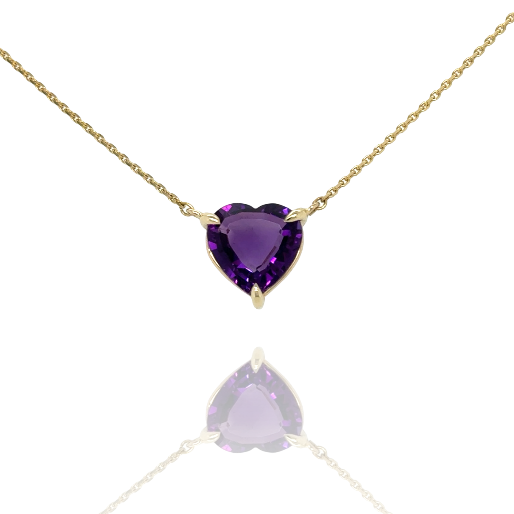 Deze unieke ketting draagt een hartgeslepen amethist van 10 bij 10 millimeter, met zorg gefacetteerd om haar natuurlijke diepte en helderheid te laten stralen. De paarse kleur is intens en gelaagd, van zacht lavendel tot diep violet, met een levendige schittering die verandert met het licht. De steen is subtiel vastgezet tussen een anker collier van 14 karaats gerecycled geelgoud met fijn gefacetteerde schakels. De ketting heeft een lengte van 43 centimeter en valt elegant op het borstbeen.