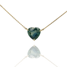 Deze unieke ketting draagt een hartgeslepen saffier in een zeldzame petrol blauwgroene kleur. De edelsteen van 12 bij 12,5 millimeter is met grote precisie gefacetteerd, waardoor haar diepe, mysterieuze kleurschakeringen oplichten bij elke beweging. Van blauw naar groen, met soms een vleugje grijs, als het oppervlak van een stil meer bij schemerlicht. De steen is zorgvuldig vastgezet tussen een anker collier van 14 karaats gerecycled geelgoud met fijn gefacetteerde schakels. De ketting heeft een totale lengte van 43,5 centimeter en valt daardoor net iets lager op het borstbeen.