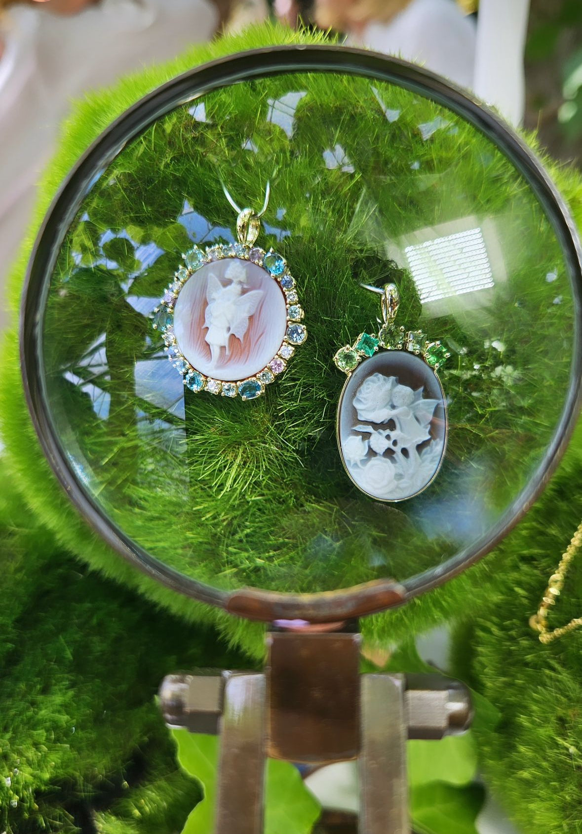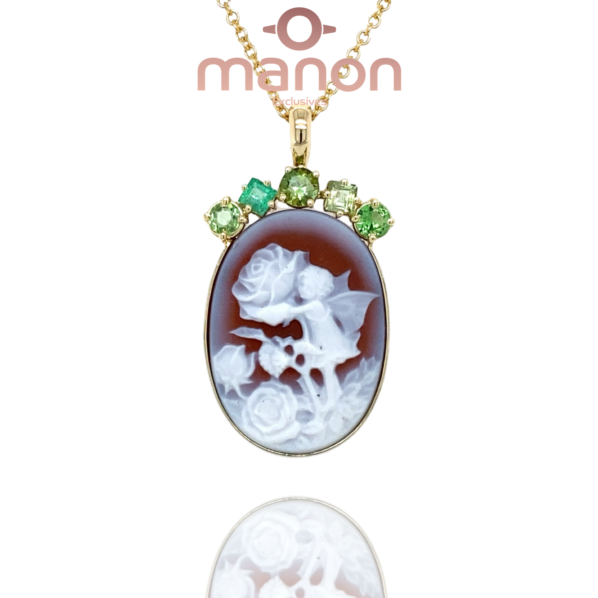 Cameo Pendant set with tsavorite, emerald and tourmaline.