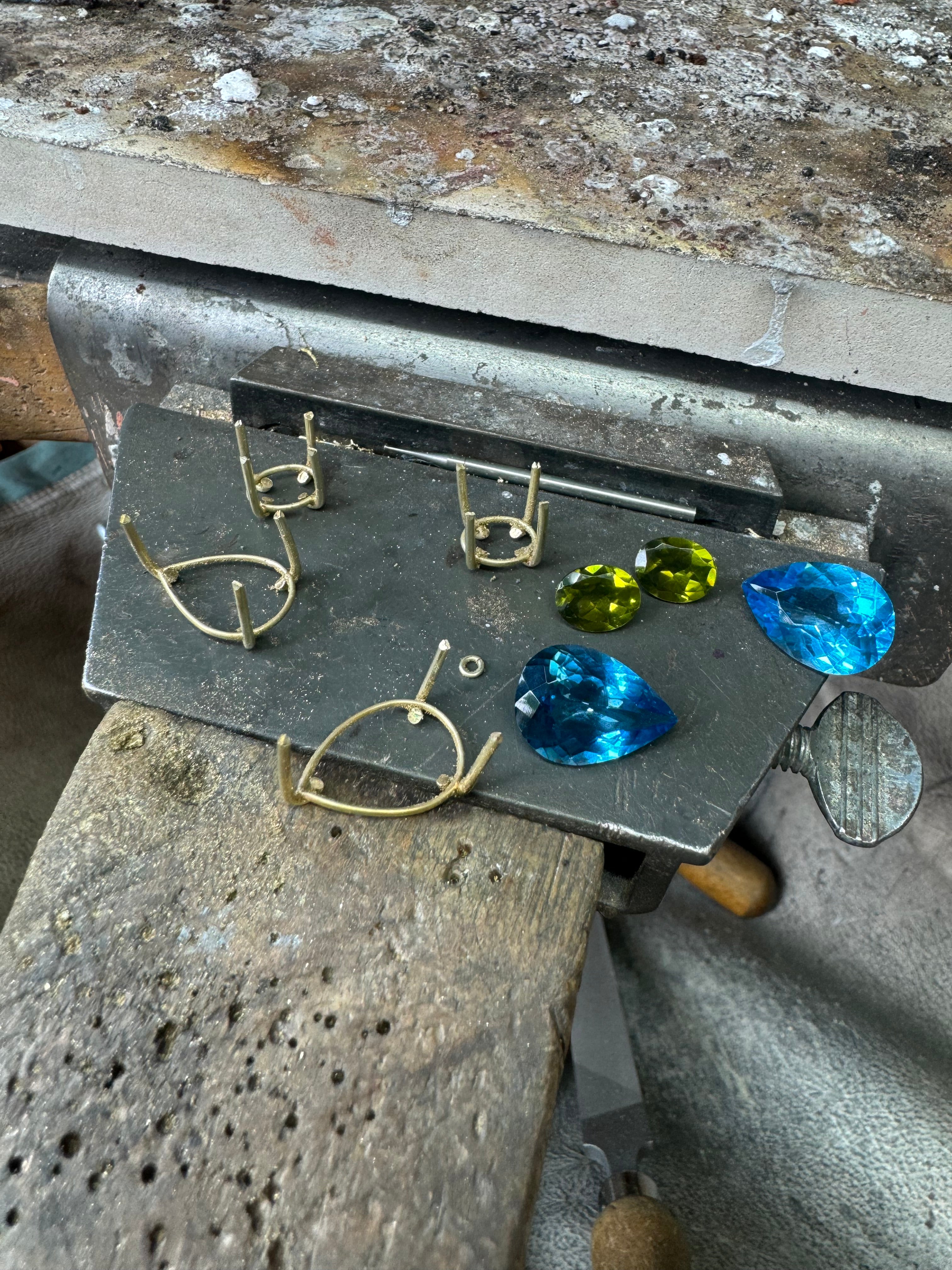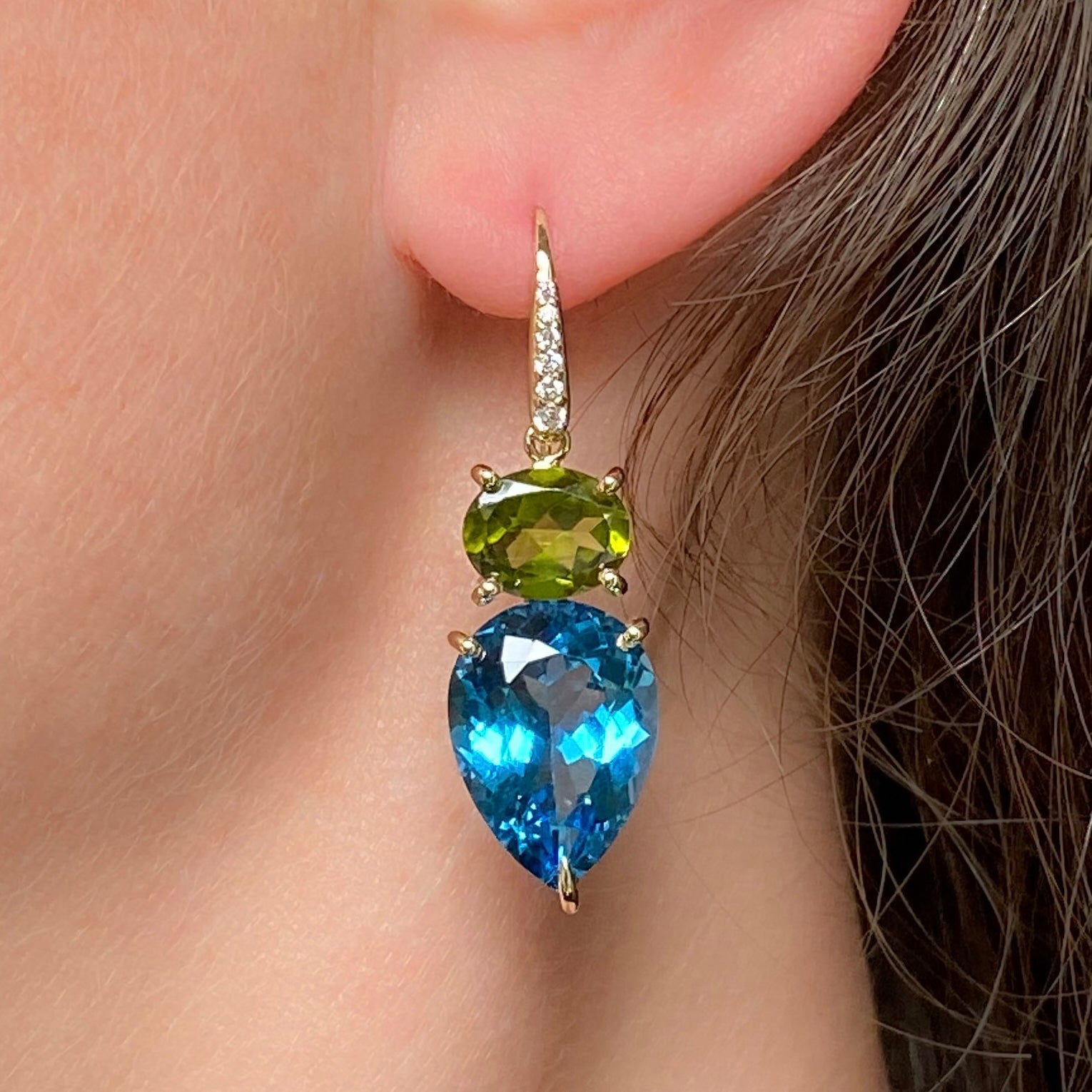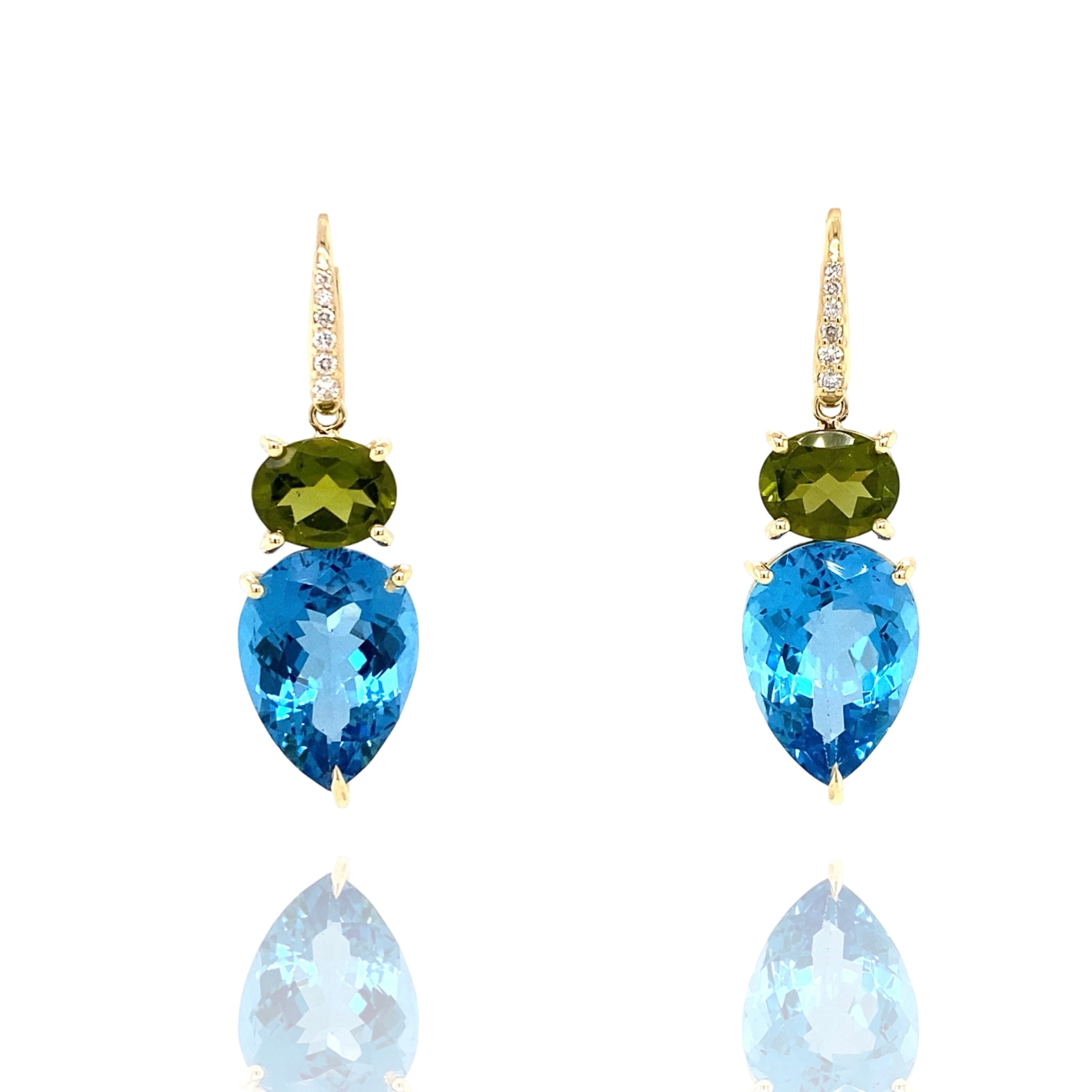 14k gold Toi et Moi ear pendants set with Blue Topaz and Peridot
