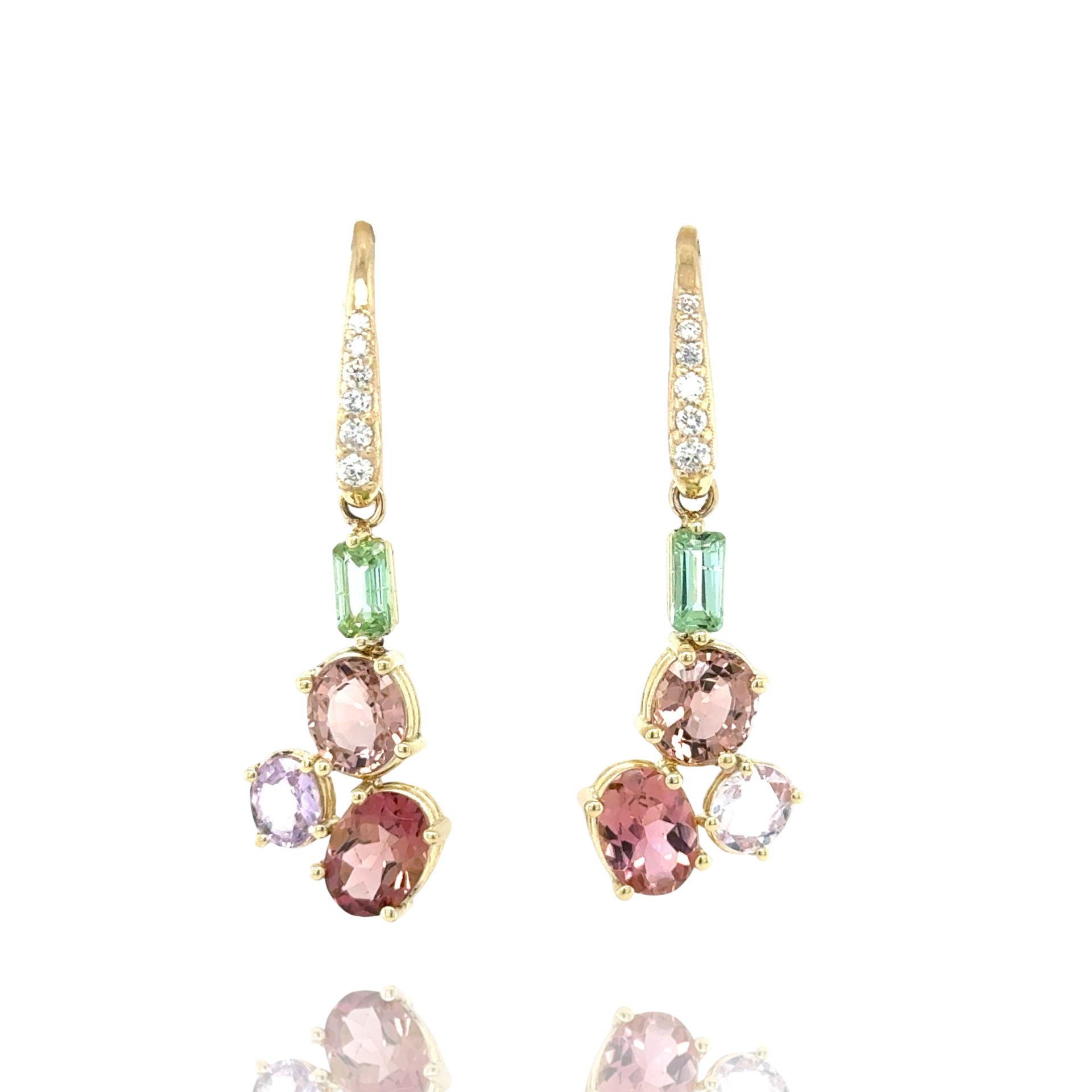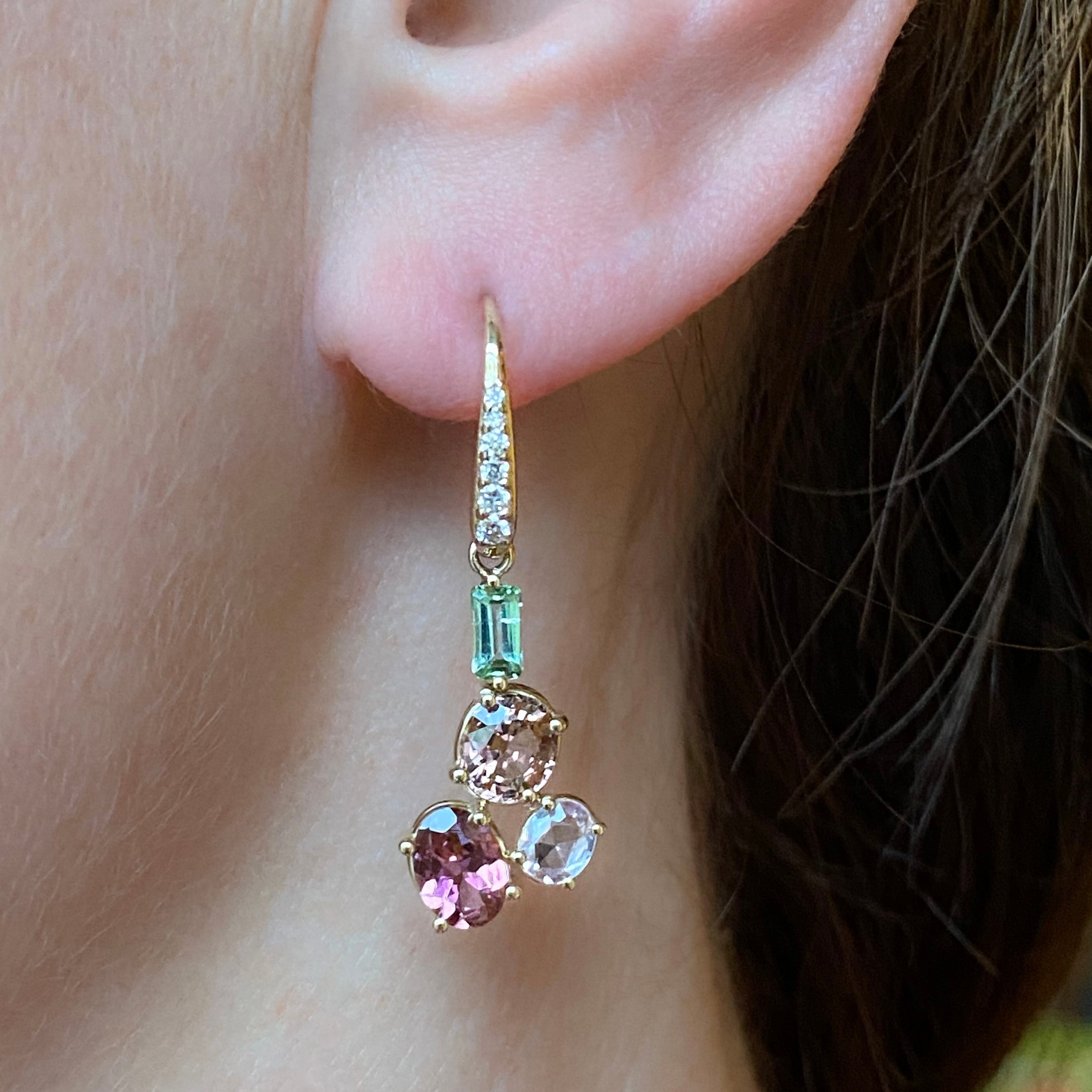 14k gold pair of earrings set with multiple gemstones in our iconic mosaic style