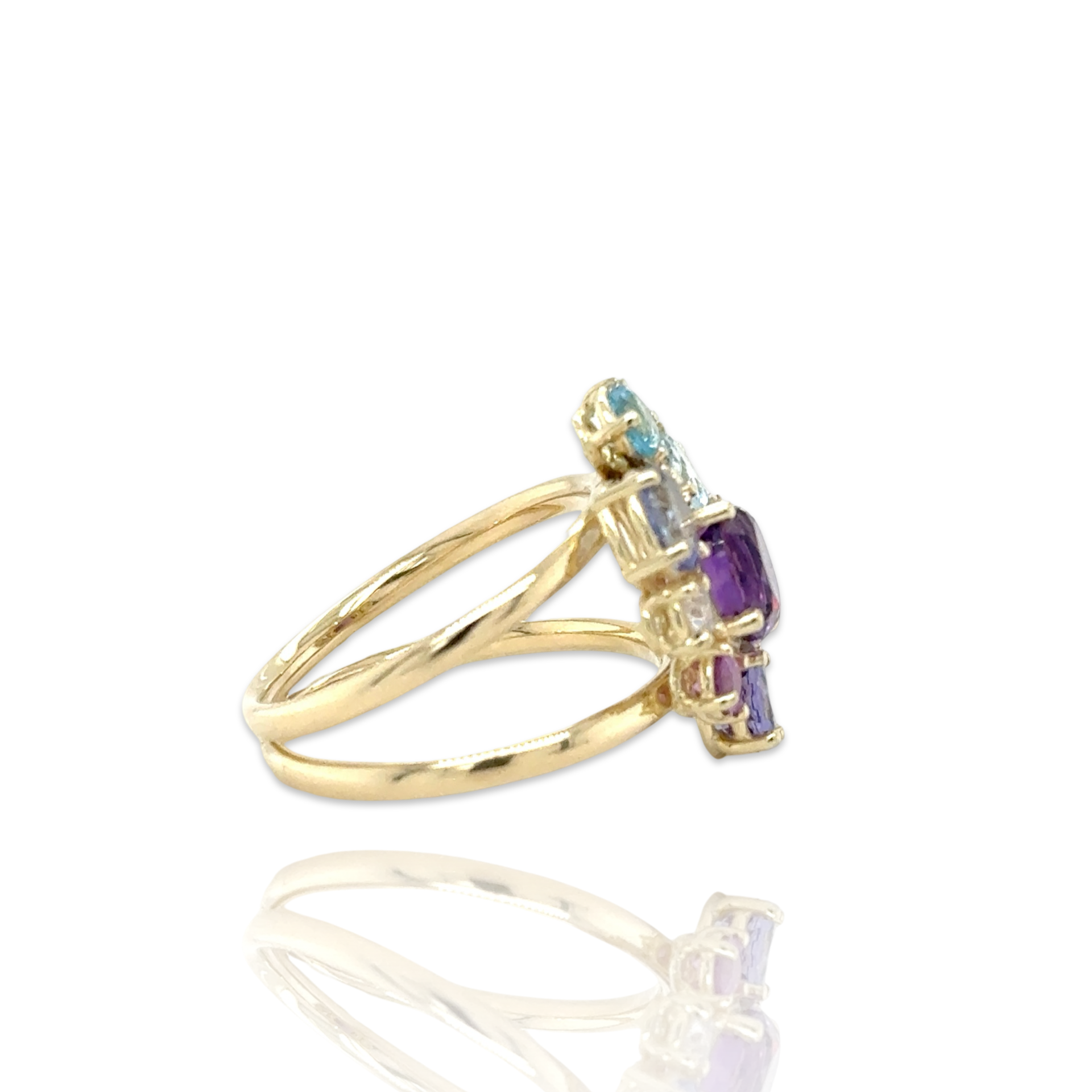 14k gold ring set with multiple gemstones in our iconic mosaic style which give a cohesive coral vibe