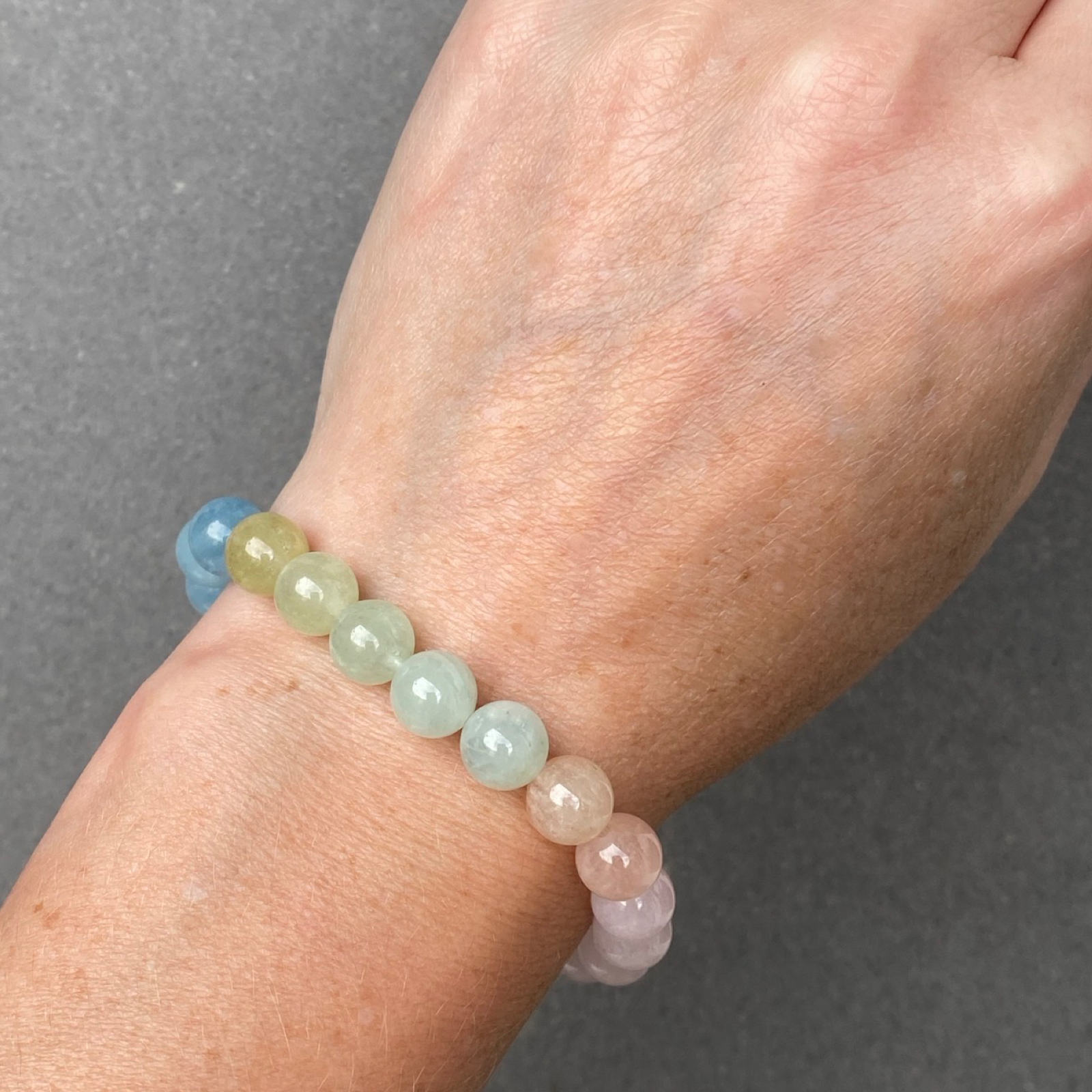 Deze Candy Gems armband is gemaakt van gladde berylkralen van 8 mm, in een verfijnde mix van zachte pasteltinten: blauw, groen, roze en geel. Elke kraal heeft een eigen nuance, waardoor de armband een serene en speelse uitstraling krijgt. Binnen de beryl-familie worden de blauwe tinten aquamarijn genoemd, terwijl de roze kralen bekend staan als morganiet – beide geliefd om hun bijzondere schoonheid en betekenis. Met een lengte van 19 cm en elastische afwerking sluit de armband comfortabel en soepel om de pols.