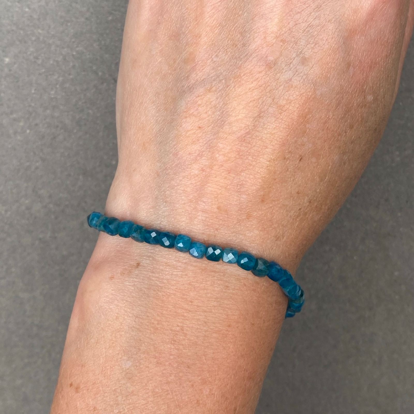 Deze Candy Gems armband is geregen met gefacetteerde fluorietkralen van 4 mm, in een intense bijna neonblauwe kleur. De kleine facetten vangen het licht en geven de armband een levendige schittering die direct in het oog springt. Met een lengte van 19 cm en elastische afwerking sluit de armband comfortabel en soepel om de pols. Fluoriet staat bekend als een steen die helderheid en concentratie brengt; ze helpt je gedachten te ordenen en geeft frisse energie.