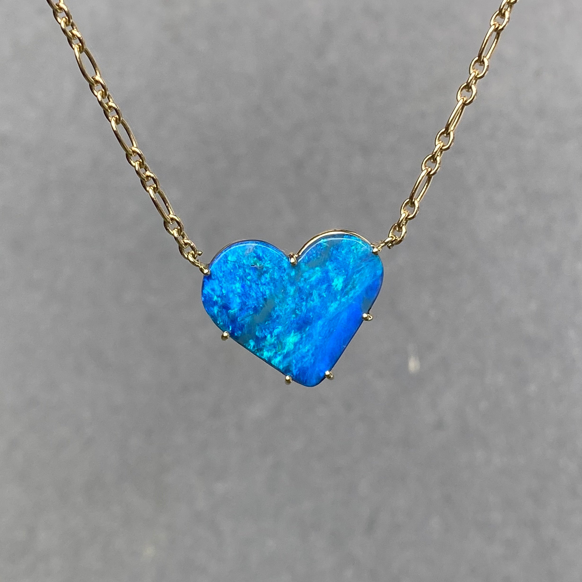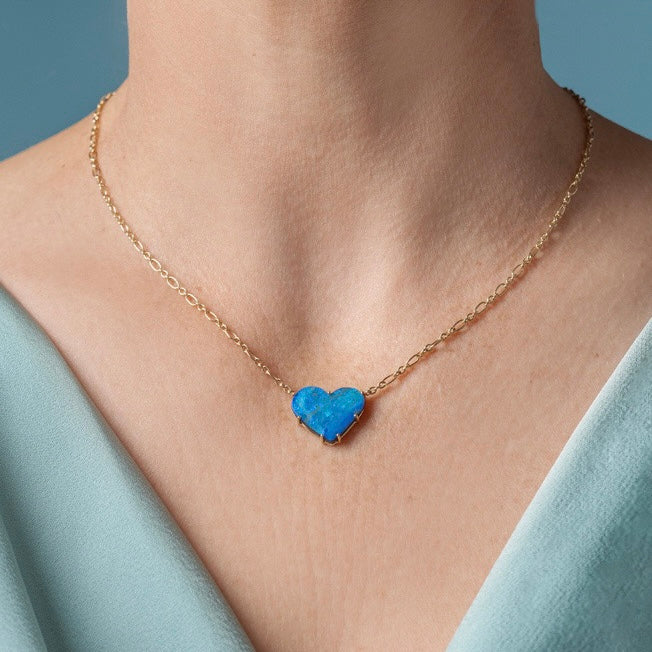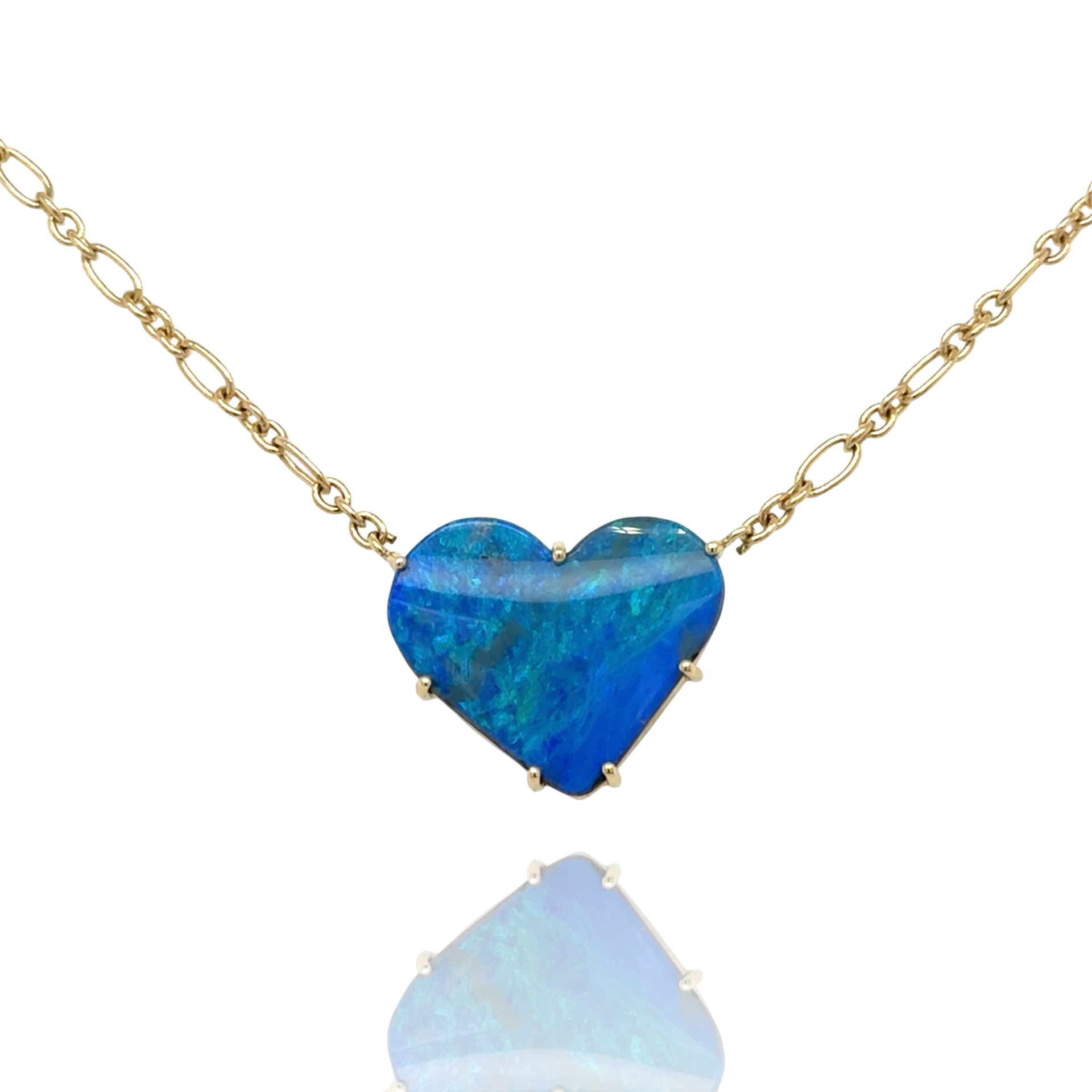 Als een glimp van een betoverende onderwaterwereld schittert Hart of the Ocean om je hals. In dit unieke ontwerp vormt een handgesneden hart van Australisch opaal het stralende middelpunt. De levendige blauwen en groenen dansen als penseelstreken over het oppervlak – een schilderij van moeder natuur, gevangen in een steen. Elke beweging vangt nieuw licht, waardoor het lijkt alsof het hart ademt.