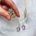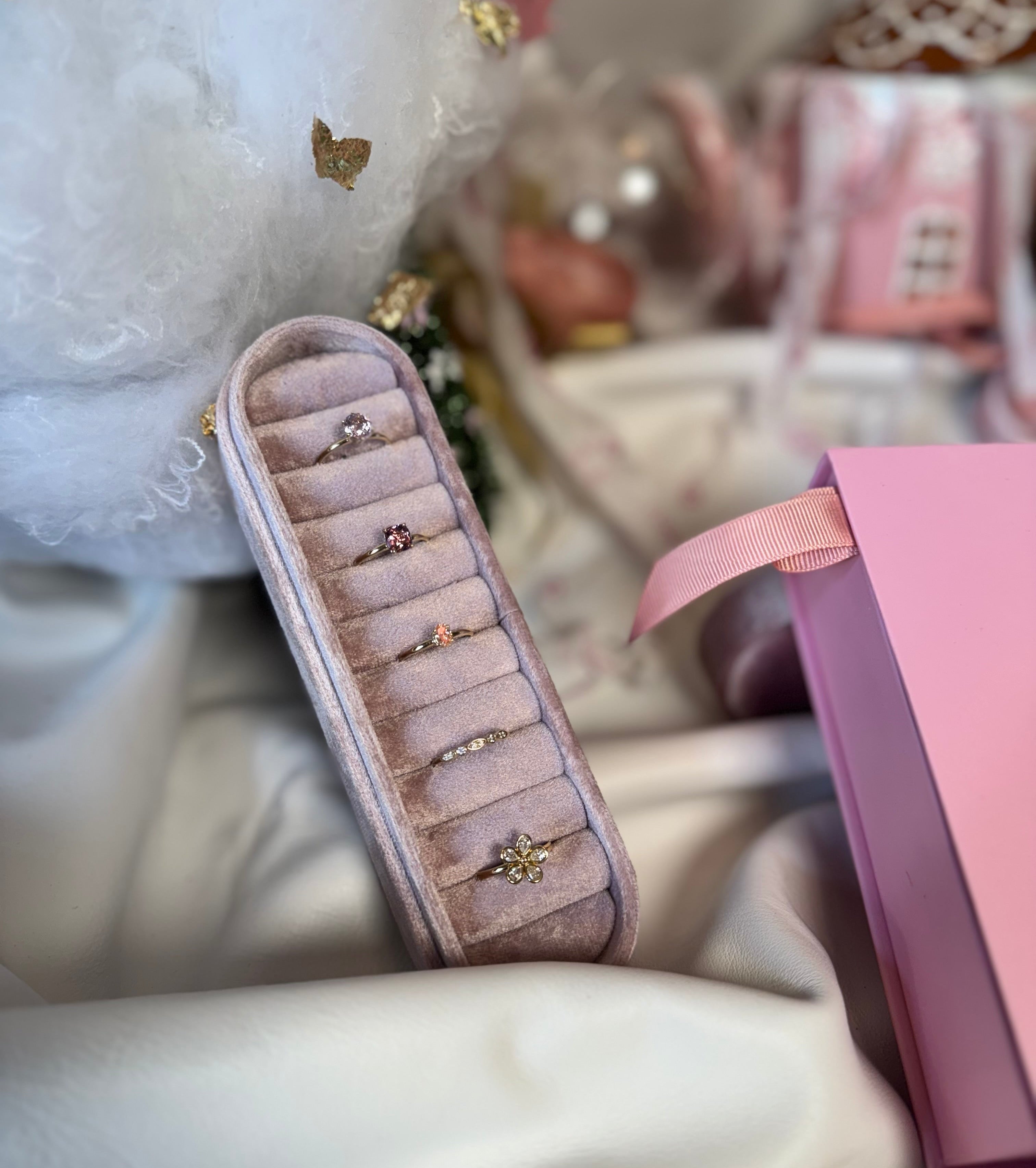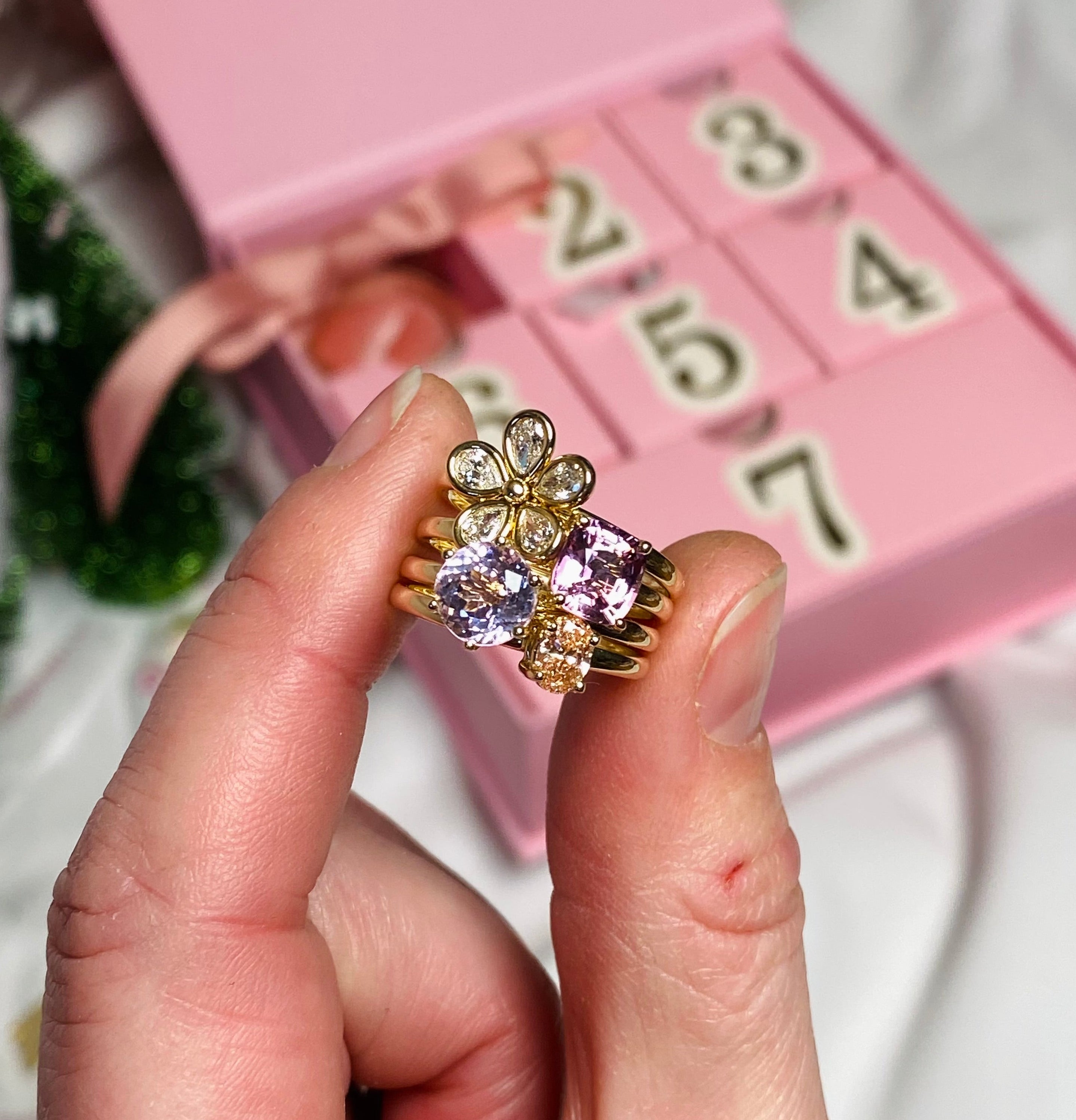 Achter elk deurtje schuilt een zorgvuldig gekozen sieraad. Denk aan de dromerige lila glans van de Rose de France oorhangers, de zachte roze energie van de Hot Air Balloon hanger met rozenkwarts en de verfijnde schittering van de Diamond Daisy ring. Je ontdekt ook de geliefde stackable ringen met kunziet en labdiamant, een diep paarse spinelring en als fonkelende afsluiter de iconische Diamond Lace ring. Elk juweel is met zorg geselecteerd om balans te brengen tussen verfijning, kleur en betekenis.