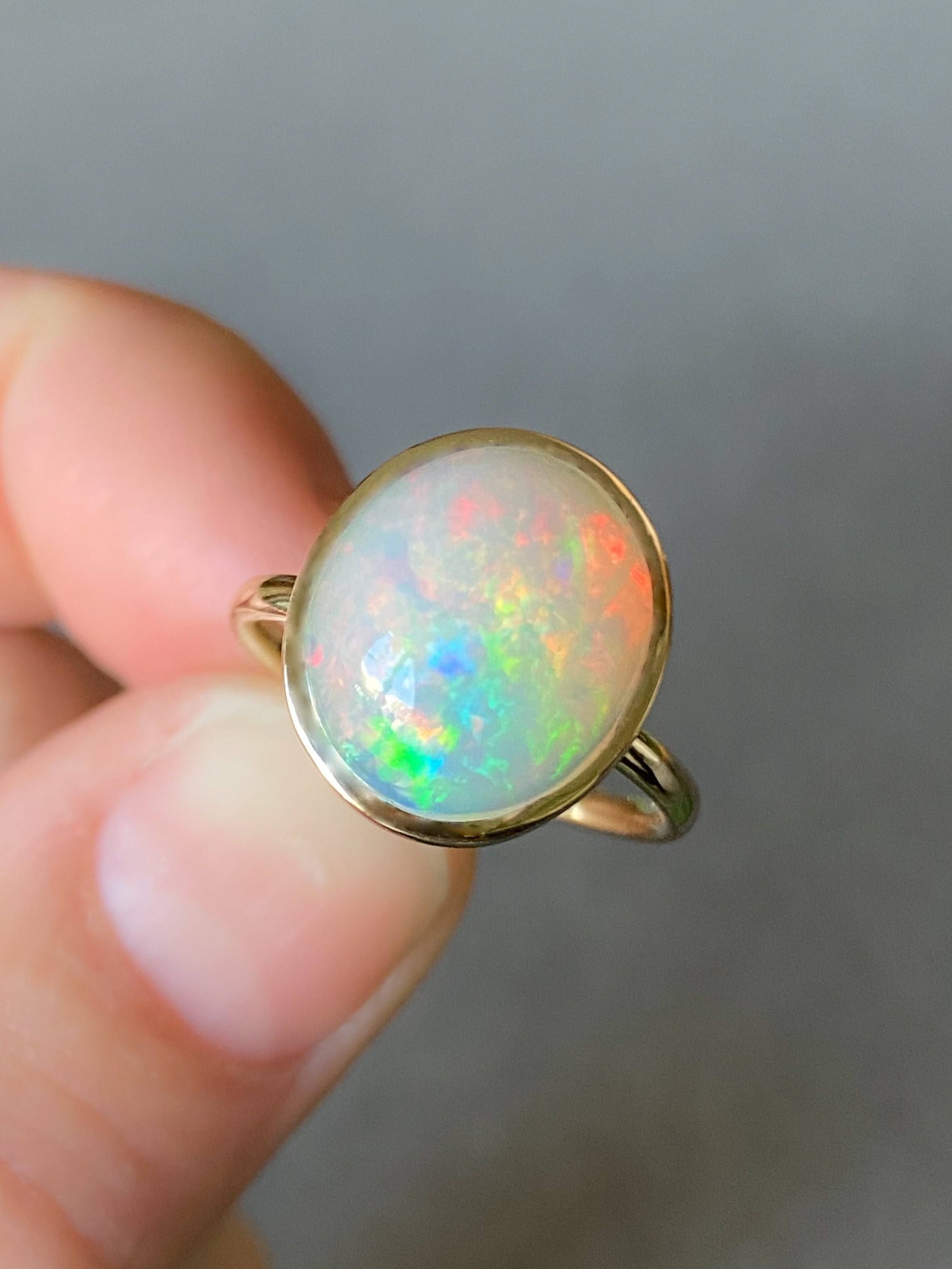 Ethiopisch opaal staat bekend om zijn levendige spel van kleuren, en deze steen is daar het perfecte voorbeeld van. De cabochon slijpvorm maakt het kleurenspectrum nog intenser – alsof je naar een wereldbol vol licht kijkt. Een krachtige, vrouwelijke ring die je steeds opnieuw ontdekt.