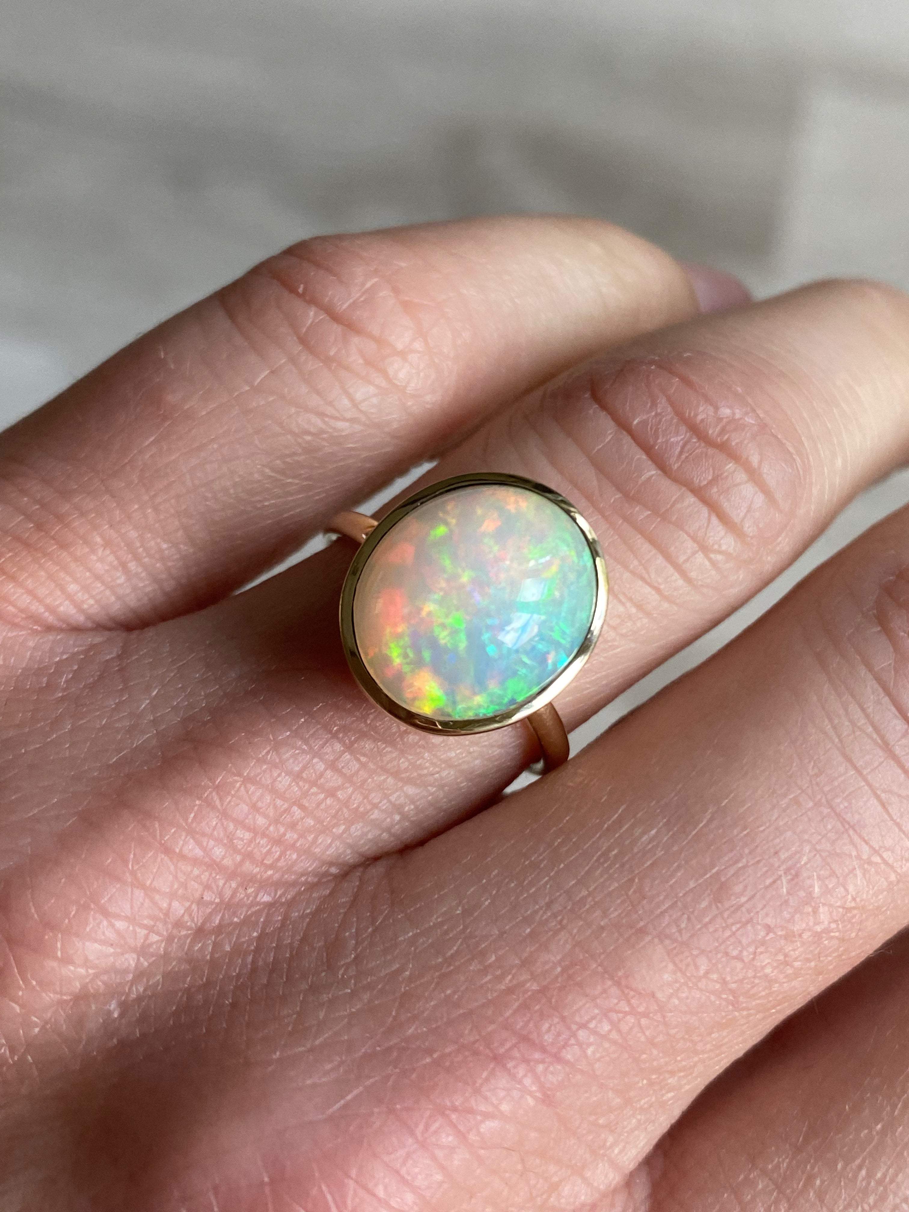 Deze ring draagt een cabochon geslepen Ethiopisch opaal van 13,5 bij 11,3 millimeter – een bol die de kleuren van de regenboog in zich draagt. Van diepblauw tot vuurrood, zachtgroen tot goudgeel: het licht danst door de steen alsof hij van binnenuit gloeit. Gezet in 14 karaat gerecycled geelgoud vormt dit sieraad een ode aan het leven in al zijn schakeringen.