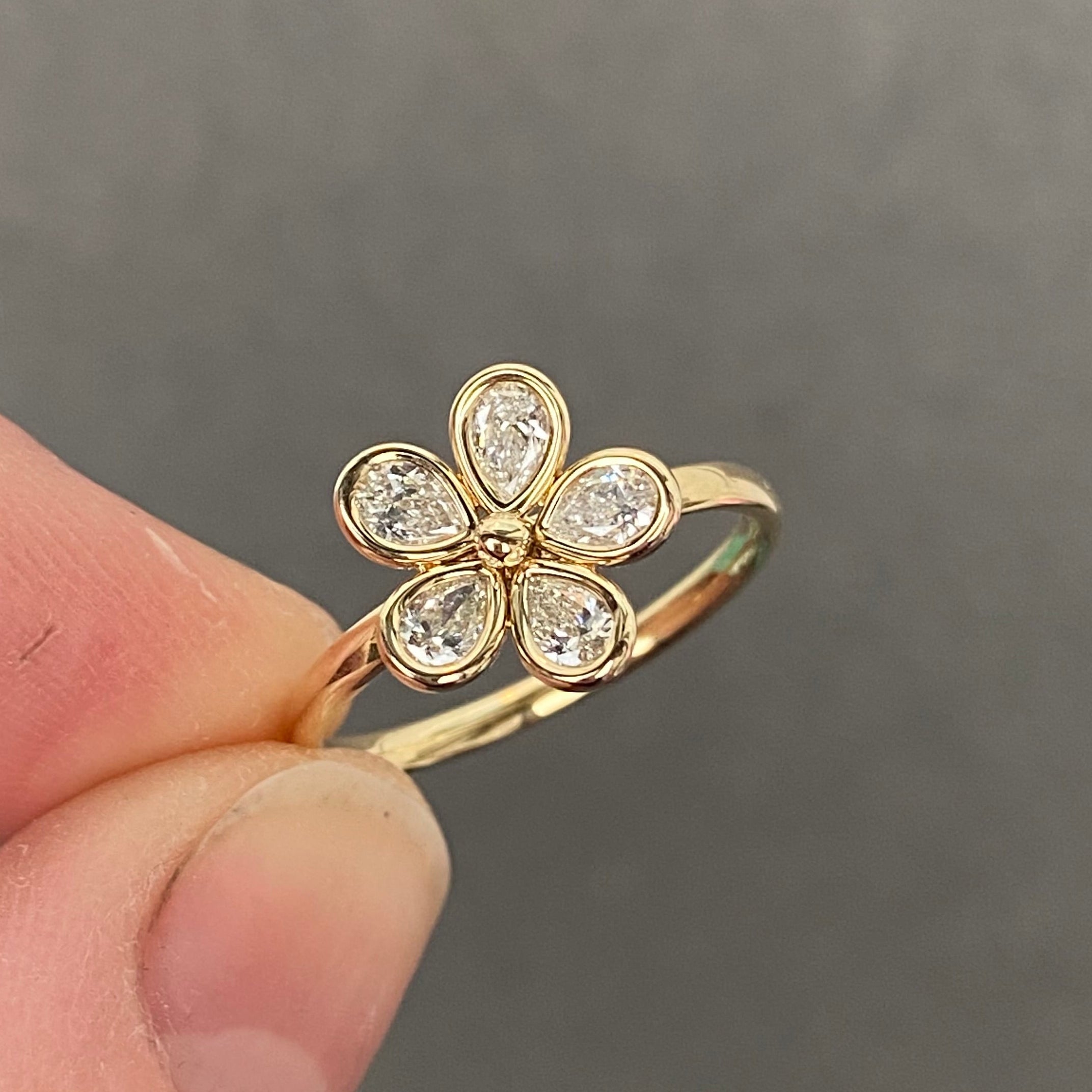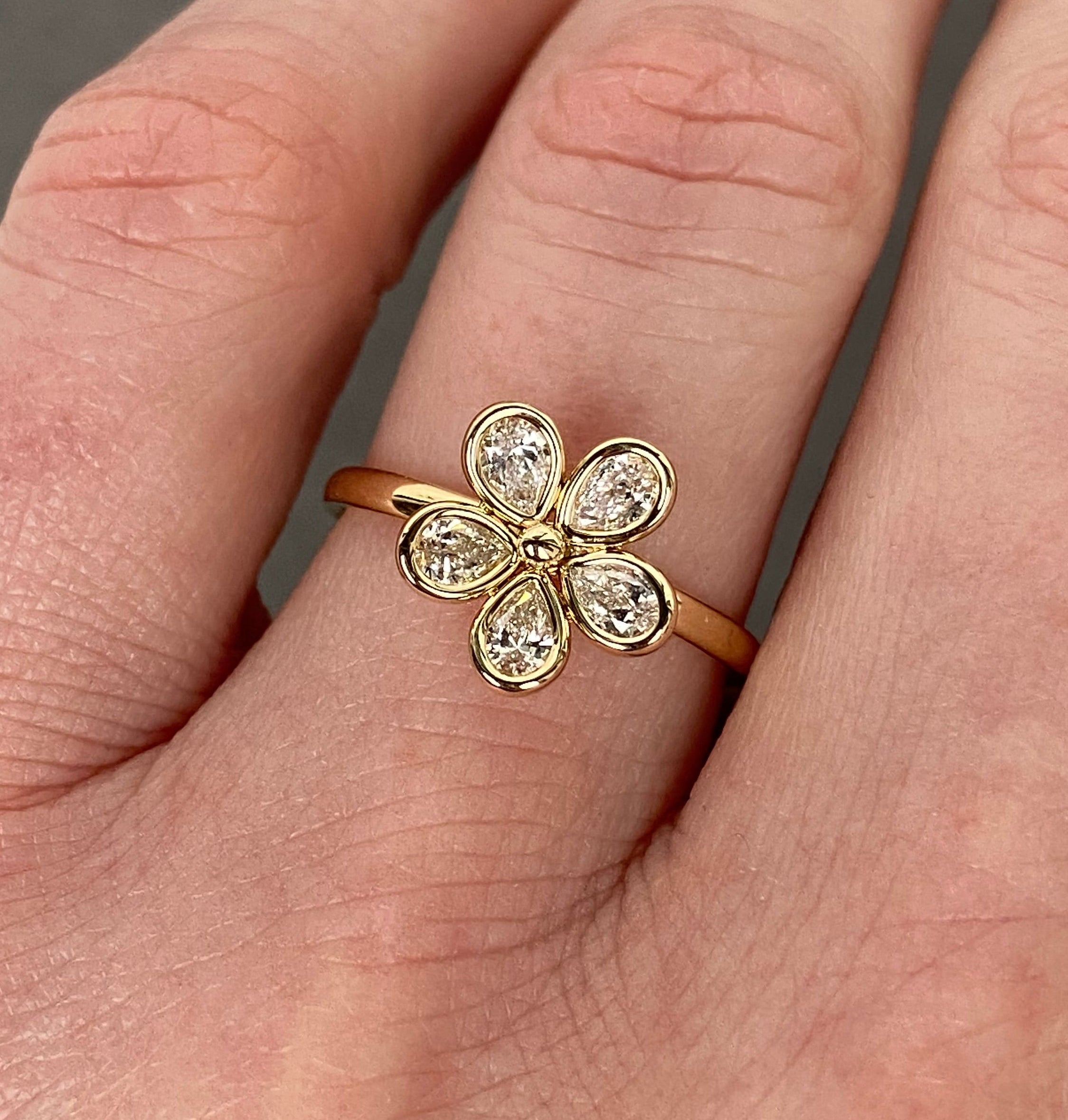 De Diamond Daisy ring is een ode aan het madeliefje, de bloem die nooit verwelkt. Met haar peervormige, gladom gezette diamanten vormt deze ring een delicate bloem, gevangen in 14 karaat gerecycled geelgoud. Elke diamant is briljant geslepen, met een kleurkwaliteit van E-F-G en een zuiverheid variërend van VS1 tot VVS2. Samen vormen ze een sprankelend geheel van 0,55 ct, gecertificeerd door IGI, dat als een bloem vol licht op je hand rust.